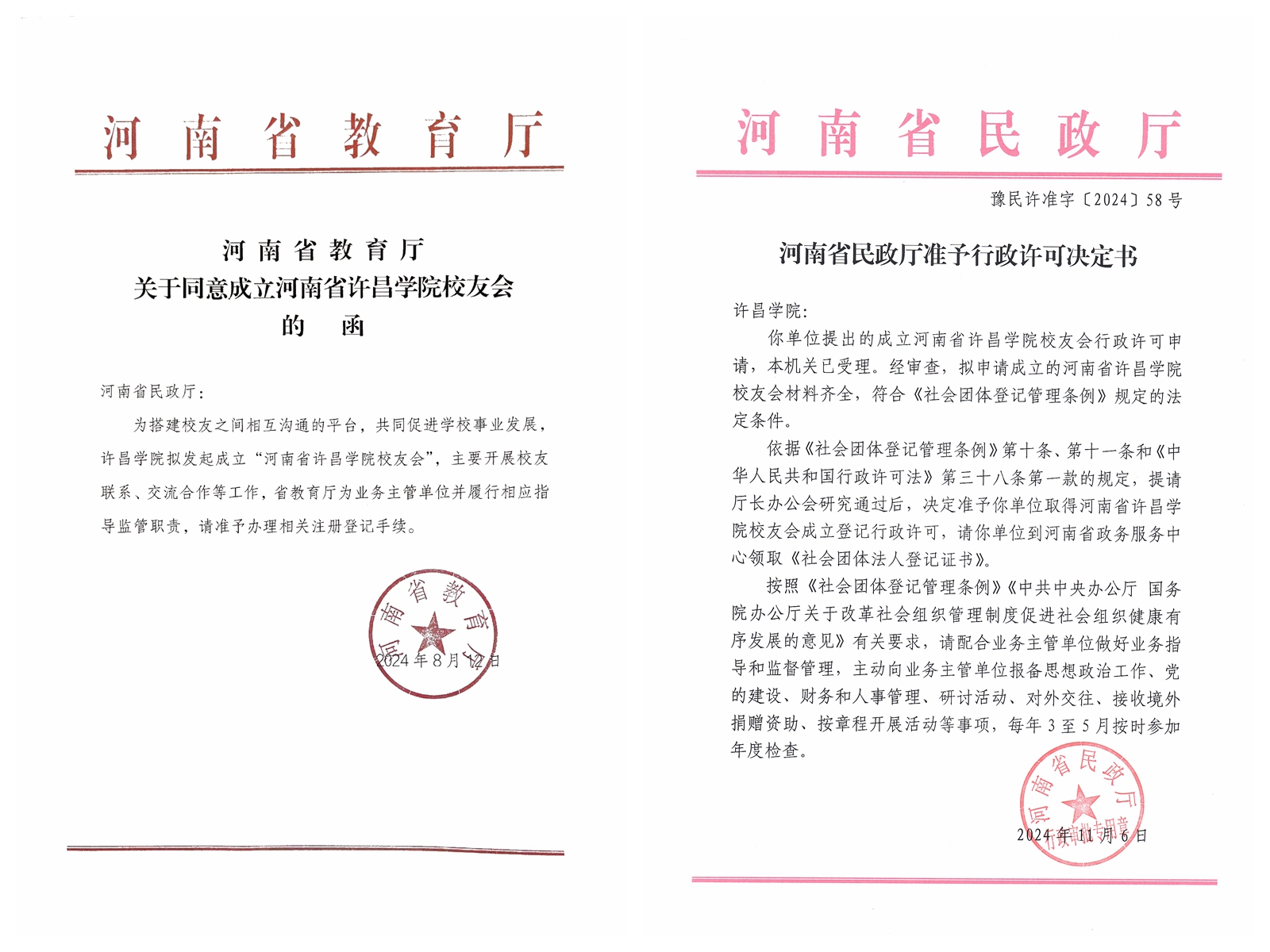 近日,在学校各项事业奋力迈进之际,在广大师生、校友的热切期盼中,河南省民政厅下发了“河南省民政厅准予行政许可决定书”【豫民许准字(2024)58号】文件,并颁发了河南省许昌学院校友会“社会团体法人登记证书”。至此,我校校友会成为由省教育厅批准、省民政厅注册登记、具有法人资格的合法社团组织。