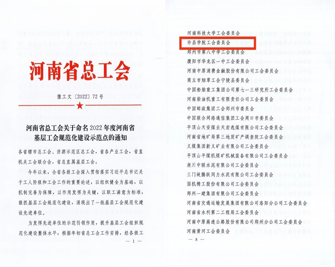 近日,河南省总工会公布了“2022年度河南省基层工会规范化建设示范点”命名结果,经过严格考核评比,我校工会脱颖而出,荣获“2022年度河南省基层工会规范化建设示范点”称号。