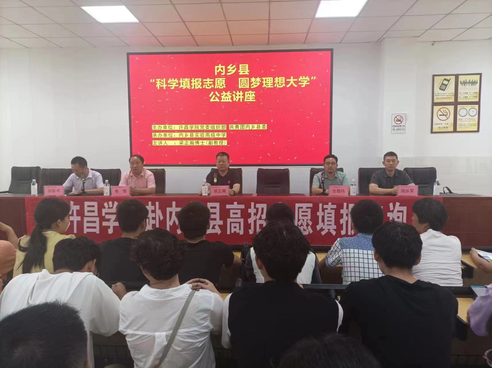 6月28日至29日,在高考放榜和志愿填报之际,为更好的帮助指导内乡县高考毕业生精准填报志愿,在共青团内乡县委协助下,我校招生专家团队到内乡实验高中开展高考志愿填报指导咨询活动。活动现场,我校招生就业处专家以“科学填报志愿 圆梦理想大学”为题开展公益讲座,现场300多名教师、家长及考生参加讲座。讲座结束后,专家们在现场开展志愿填报“一对一”咨询活动。学生家长和考生纷纷表示听了专家意见之后开阔了视野,填报志愿目标更加清晰明确。当天活动结束后,党委组织部一行到内乡县牧鑫生物科技有限公司洽谈购买学校“七一”表彰人员奖品,以实际行动贯彻落实消费帮扶政策。(图片由党委组织部提供)