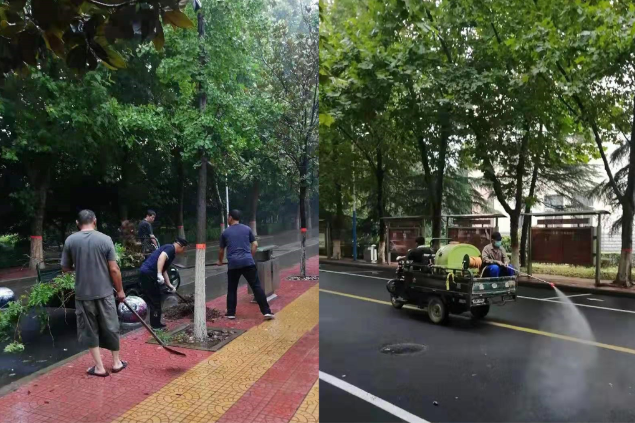 全力做好汛期应对工作。汛情来临后,校领导第一时间带队冒雨巡查校园,分析险情,确保配电室、变压器安全。后勤管理服务中心组织能源保障部门迅速分组到创业中心负一楼、文综楼负一楼查看险情,进行积水抽排。相关人员立即检查房屋、配电设施、树木等受灾情况,并及时组织恢复和维修。家属区物业公司两昼夜不间断地对地下停车场进行排水,并持续疏排院内积水、污泥。兴华路校区总务科加强教工餐厅值守巡查,严防死守确保教工餐厅房舍安全。党委保卫部加强24小时值班值守,对校园重点区域定时、定点巡查,对危险积水点安排专人守护提醒。面对先后被淹的文科综合楼消防泵房、食品与药学院楼消防泵房和兴华路校区东院消防泵房,巡逻人员、消防值班人员冒着漏电的危险接通排污泵电源,持续向外抽水48小时,直到倒灌雨水排完。