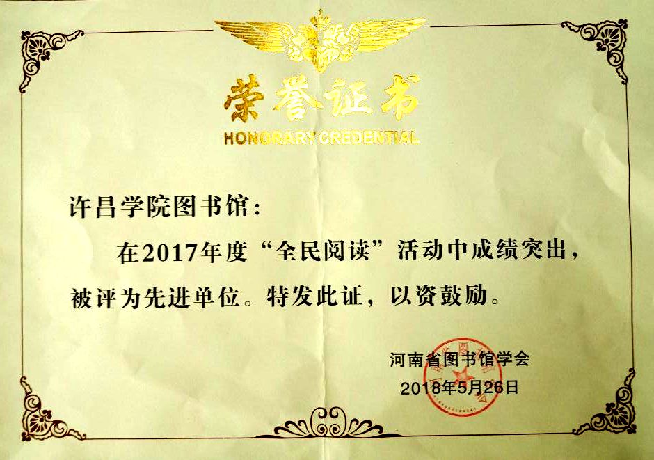 近日,从河南省图书馆学会理事会上传来喜讯,我校图书馆被河南省图书馆学会授予“2017年度全民阅读先进单位”荣誉称号,这已是我校图书馆第九次获得此项荣誉。