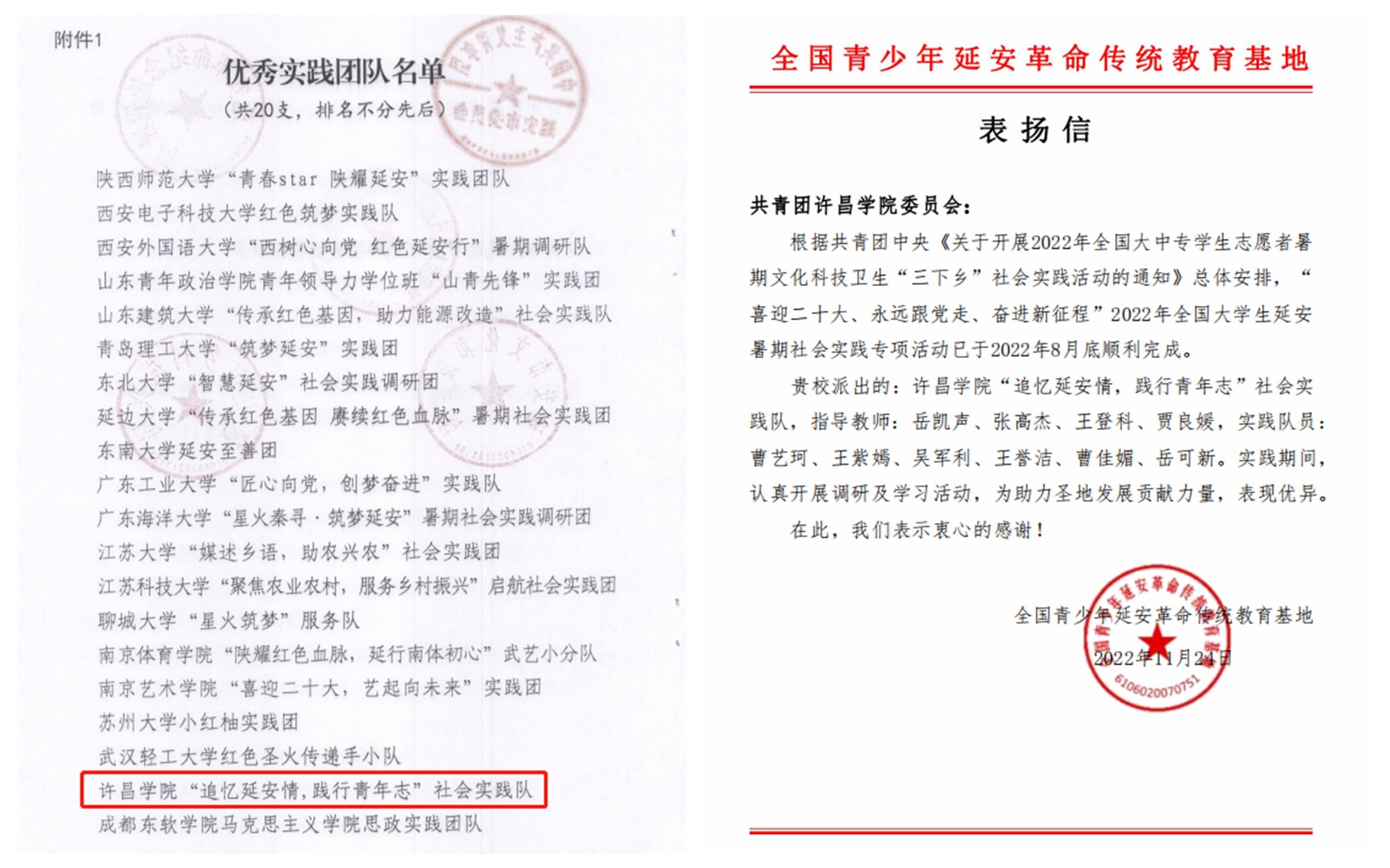 在延安期间,该实践队寻访红色革命旧址,认真学习革命历史,追忆红色圣地上的革命情怀,围绕继承和发展延安精神,到延安大学进行实地调研,通过与延安大学师生进行集中座谈交流以及发放网络调查问卷等形式,深入了解把党中央在延安十三年的历史融入思政大课堂的途径和方法。实践队积极参与阶段性成果汇报并与教育基地举行了“许昌学院延安革命传统教育基地”挂牌仪式。实践队坚持“知行合一”,分析整理活动期间搜集的各项数据,向主办方提交了两篇高质量的调查报告。