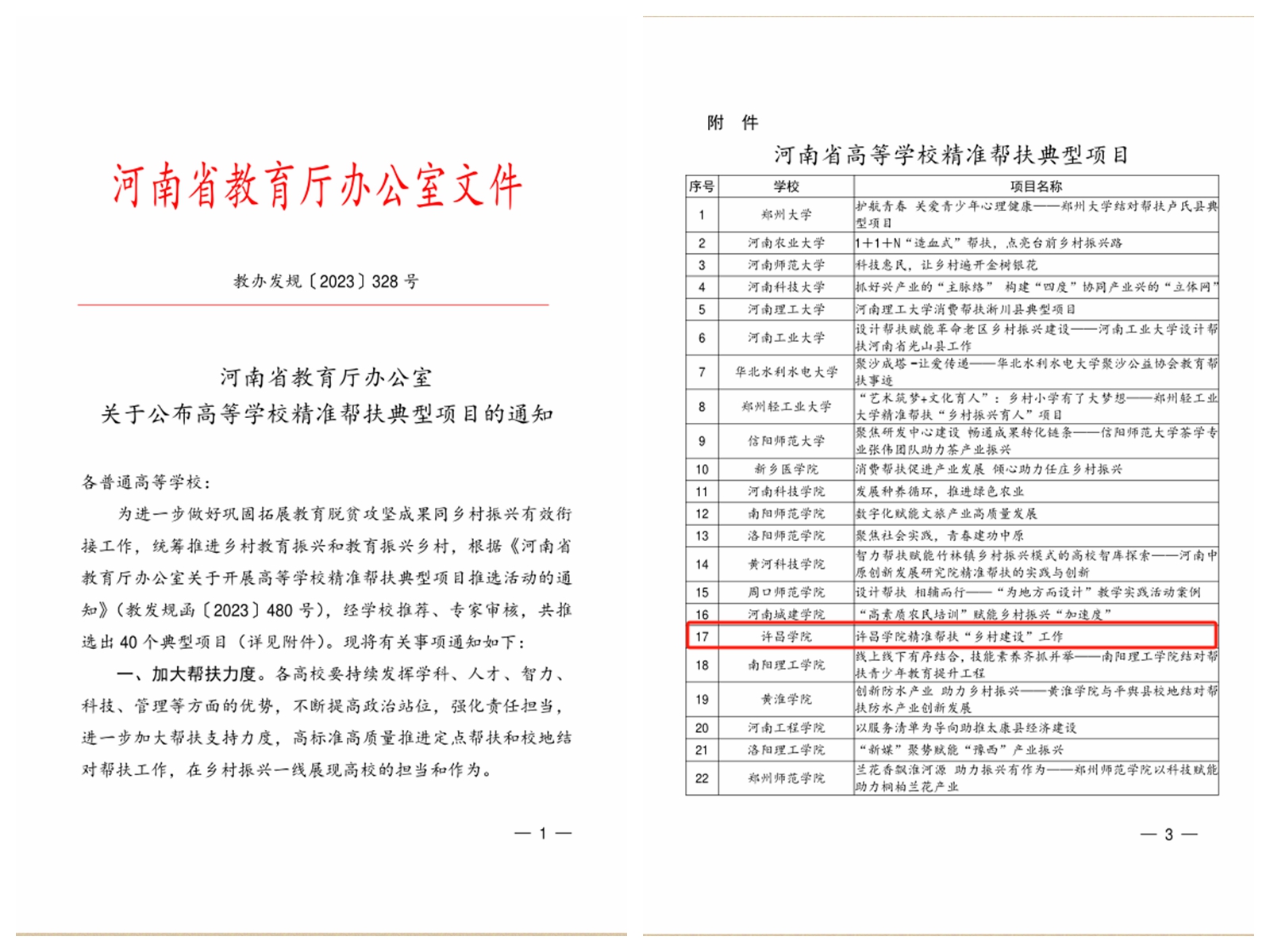 近日,河南省教育厅公布《关于公布高等学校精准帮扶典型项目的通知》(教办发规〔2023〕328号),我校申报的《许昌学院精准帮扶“乡村建设”工作》被评为全省高校精准帮扶典型项目。