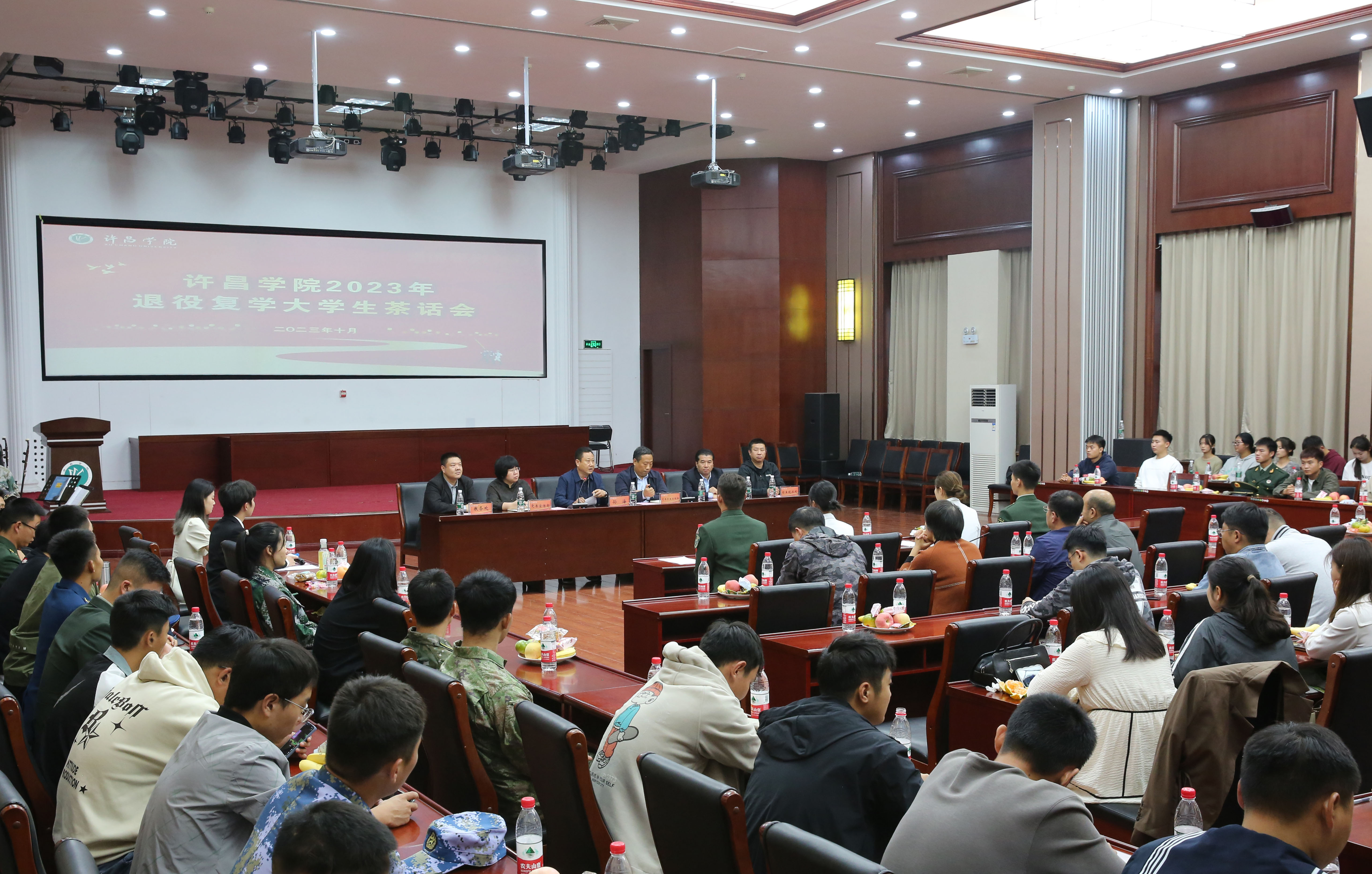 10月13日下午,我校在学生中心一楼学术会议大厅组织召开“强国复兴有我”2023年退役复学大学生茶话会。校党委副书记孙海出席会议,学校相关职能部门、各二级学院学生工作负责人、辅导员代表以及全体退役复学大学生参加茶话会。