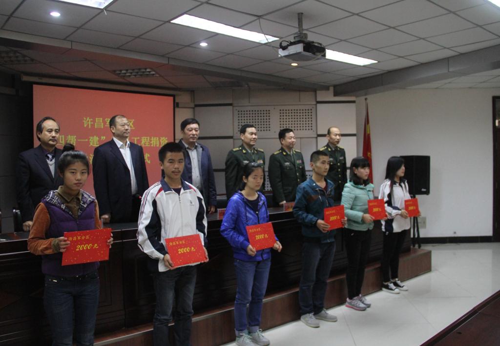 仪式上,许昌军分区政治部雷成伟主任讲话。他说,资助许昌高校的贫困学子是落实习近平主席关于加强军民共建一系列重要讲话精神的重要举措,是落实 “四帮一建”扶贫开发工作指示精神的需要,更是军分区践行党的群众路线、一心一意为群众服务、踏踏实实为民谋福利的实际行动。他感谢许昌学院多年来对许昌军分区工作的大力支持,希望同学们锻炼好体魄,不断磨砺心智,勤奋学习,将来能建功立业,实现富国梦、强国梦和个人梦。