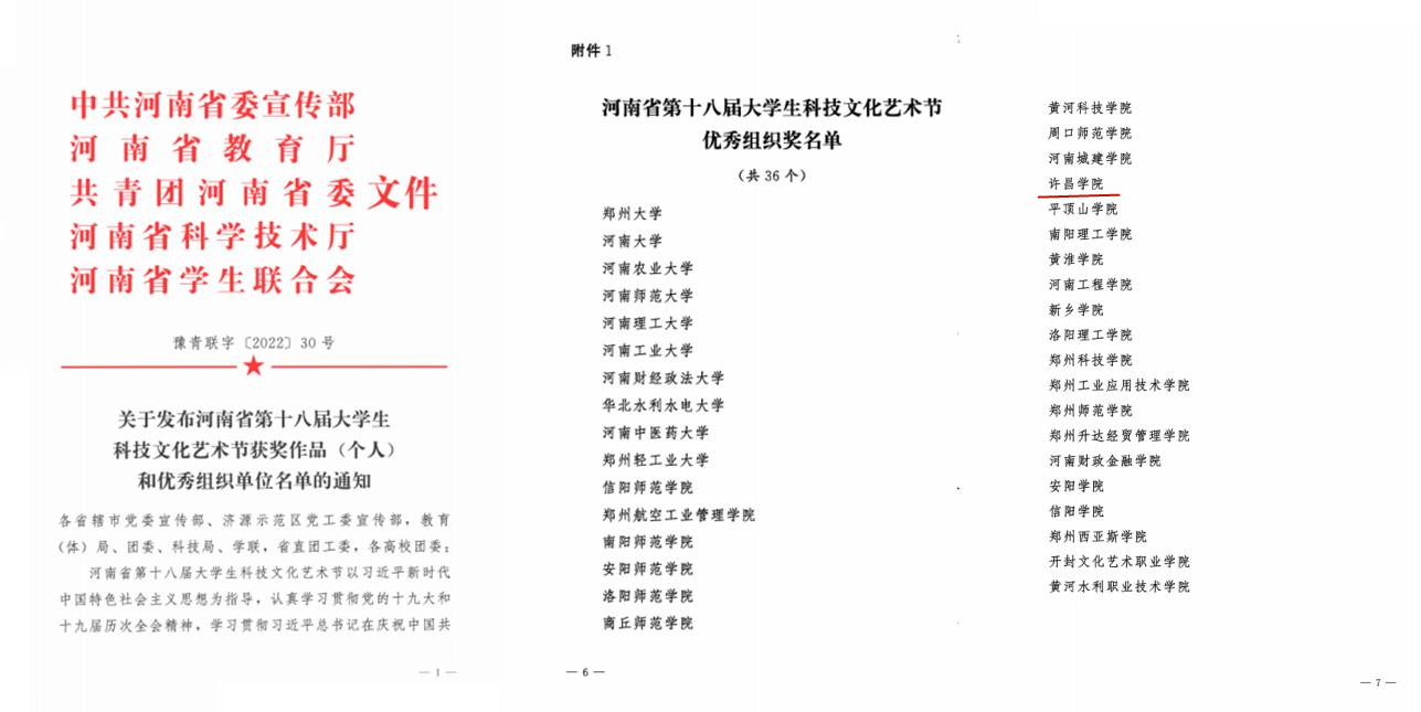 近日,由中共河南省委宣传部、河南省教育厅、共青团河南省委、河南省科学技术厅、河南省学生联合会共同举办的河南省第十八届科技文化艺术节圆满结束。我校获评“优秀组织奖”,音乐舞蹈学院教师李卫玲获评“优秀指导教师”,《爱永在》等3项作品获得一等奖、《青年的声音》等12项作品获得二等奖、《点点荧光,以身筑星河》等12项作品获得三等奖、《学子赋》等3项作品获得优秀奖。