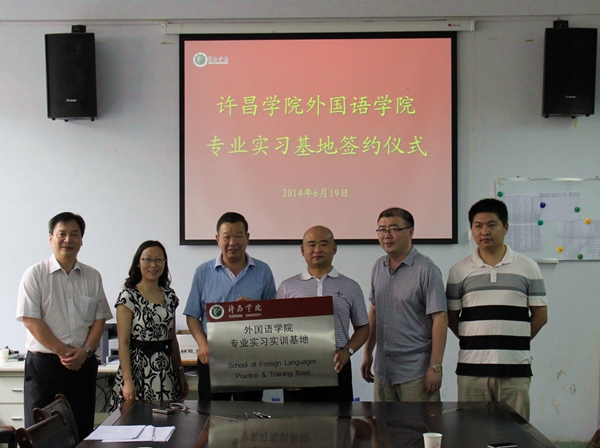 6月19日上午,外国语学院2014年新建专业实习基地签约仪式在学院外国语学院举行,许昌学院副院长张建军教授应邀出席并讲话。参加仪式的企业代表有许昌瑞宇商贸有限公司经理白光宇、许昌海亚进出口贸易公司经理陈利磊、广州华宇商贸有限公司经理王鹏。外国语学院班子成员及部分教师代表也参加了仪式。签约仪式由外国语学院党总支书记许涛主持。