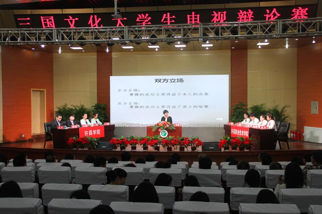 4月28日晚,许昌第八届三国文化旅游周大学生电视辩论赛在我校学术报告厅圆满落幕。来自南京晓庄学院、洛阳师范学院、许昌职业技术学院和许昌学院四校的大学生辩论队应邀聚首许昌,纵论三国。经过三场精彩辩论,洛阳师范学院代表队荣获冠军,许昌学院代表队以微弱劣势屈居亚军,南京晓庄学院、许昌职业技术学院代表队并列第三名。南京晓庄学院周玉员,洛阳师范学院赵永发,许昌职业技术学院张娇娇,许昌学院郑紫健四名同学获“最佳辩手”称号。许昌市政府副市长秦春梅、许昌市政协副主席张巍巍、许昌学院党委书记王清义、党委副书记马超以及参赛高校领导和许昌市有关领导观看比赛并为获胜代表队和获奖选手颁奖。