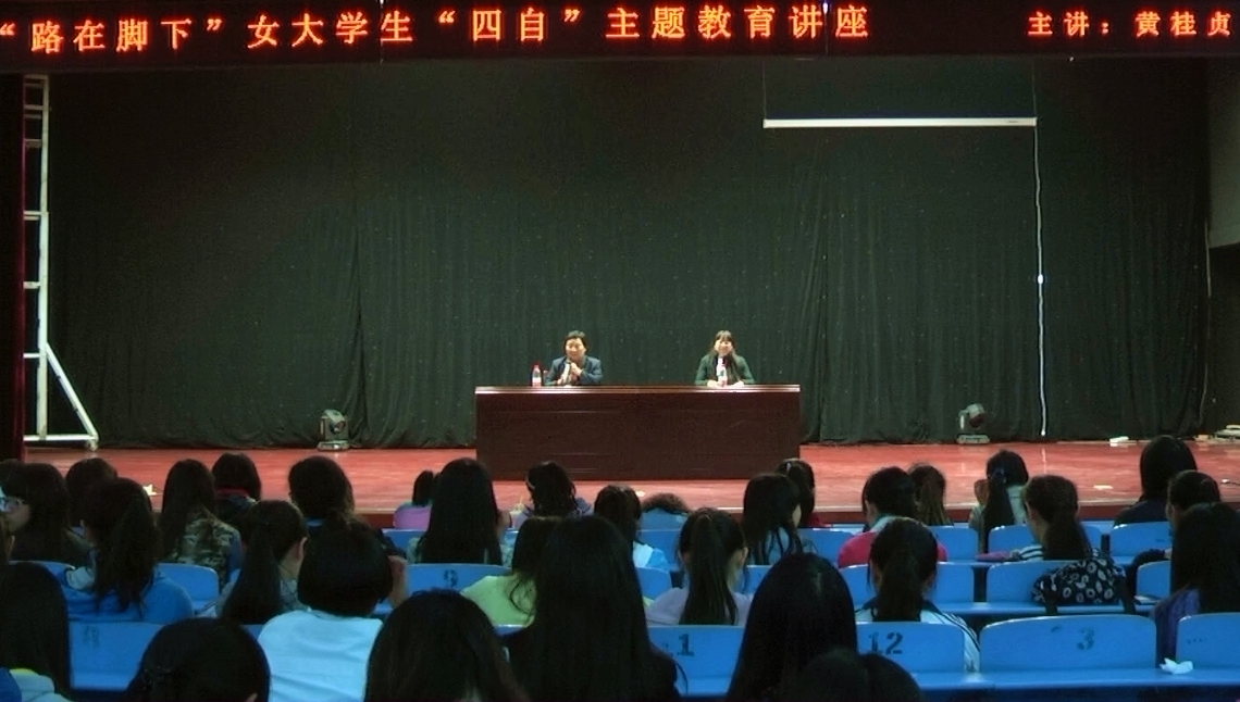4月16日晚上,由校学生处主办、美术学院承办,女大学生“四自”专题讲座在校大学生活动中心顺利举行。我校前党委副书记、现校关工委副主任黄桂贞做了题为《路在脚下》的专题报告。