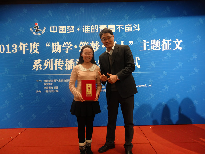 12月26日下午,全国高校“助学·筑梦·铸人”主题征文活动颁奖典礼在北京中国地质大学隆重举行,我校国际教育学院郭榆煊同学受邀参加此次颁奖典礼,她撰写的《有梦想,在路上》一文荣获此次征文大赛优秀奖。