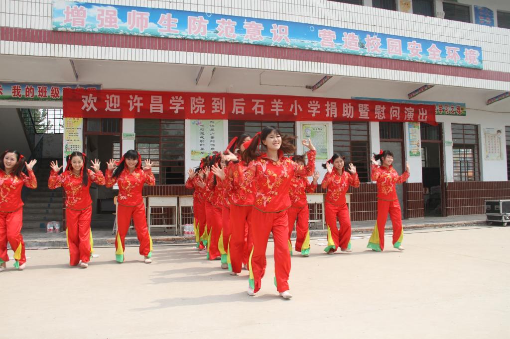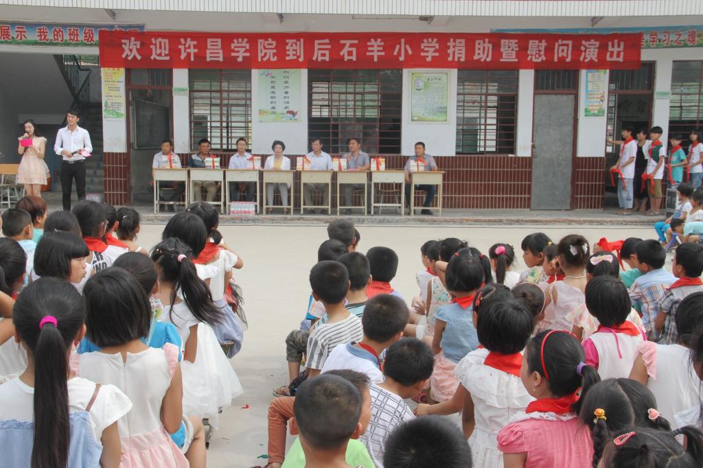 5月30日,六一儿童节到来之际,我校纪委书记罗凤英带领关工委、对口扶贫工作组等相关部门领导和我校慰问演出小分队的同学们一行40余人,来到我校对口帮扶单位——周口市西华县黄桥乡后石羊村小学,进行图书、学习文具等捐赠活动和慰问演出,为小朋友带来了节日的祝福。