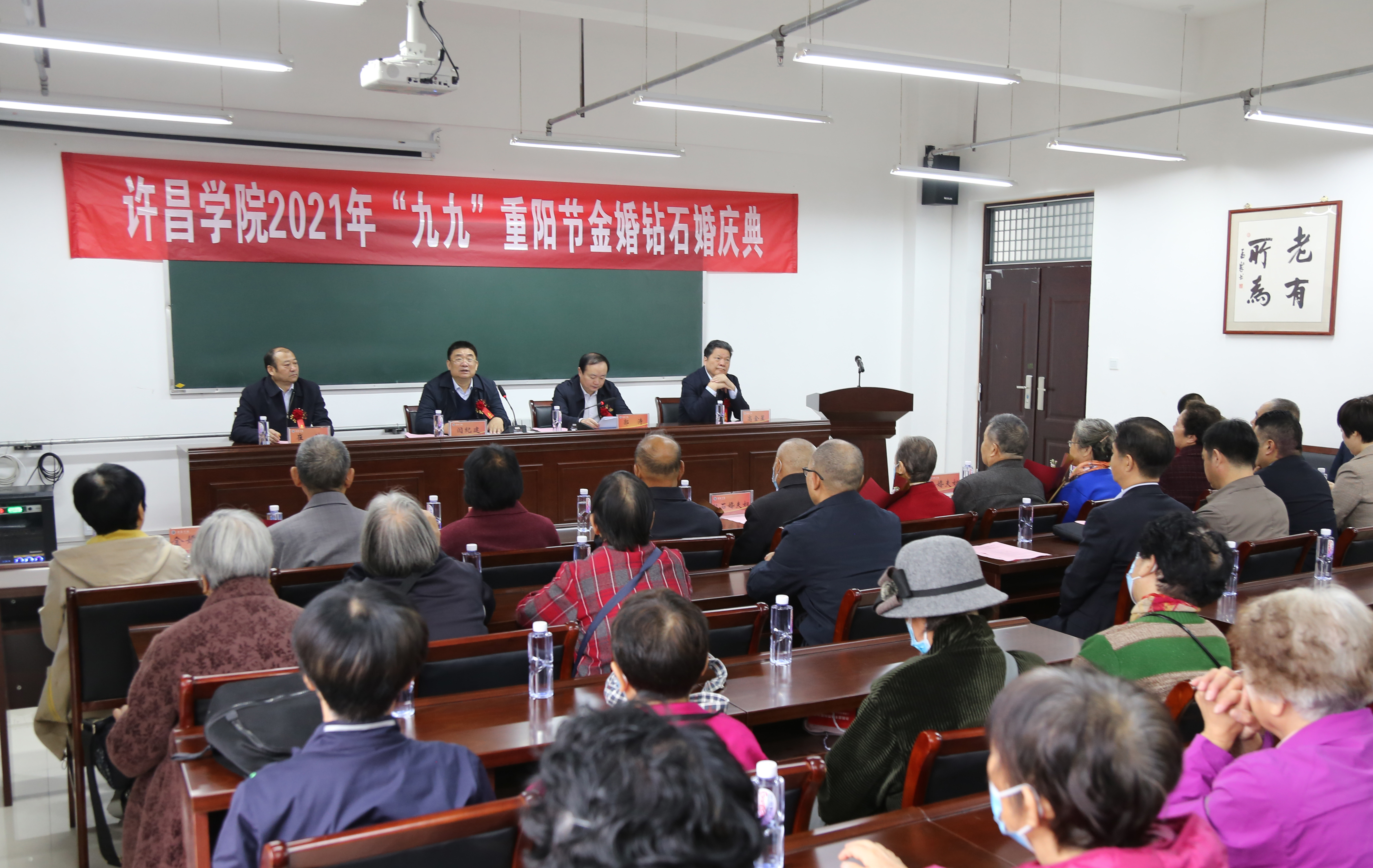 莫道桑榆晚,人间重晚晴。10月14日上午,我校在教师活动中心老年大学教室举行2021年重阳节金婚钻石婚庆典,校党委书记闫纪建,党委副书记、工会主席郭涛,副院长崔斌、高金星出席,党委办公室、组织部、后勤管理服务中心、离退休工作处等单位负责同志和5对金婚钻石婚伉俪、离退休老同志代表参加。庆典仪式由党委副书记、工会主席郭涛主持。