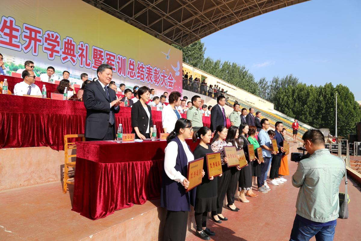 9月21日上午,我校在学校羽飞田径场举行2018级新生开学典礼暨军训总结表彰大会。校党委书记闫纪建、校党委副书记孙海、纪委书记罗凤英、副院长崔斌、黄怡俐、郭涛,工会主席高金星出席大会。许昌军分区战备建设处处长陈福星、魏都区武装部政委牛听甫也出席活动并在主席台就坐。学校机关各部门和二级学院负责人、各团总支负责人、辅导员(班主任)和全体2018级新生共同参加会操活动和开学典礼。仪式由党政办公室主任潘春彩主持。