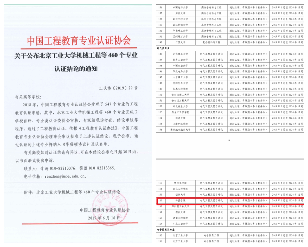 6月13日和16日,教育部高等教育教学评估中心、中国工程教育专业认证协会分别下发了《关于公布2018年度通过工程教育认证的专业名单》和《关于公布北京工业大学机械工程等460个专业认证结论的通知》,公布了2018年参加全国工程教育专业认证的部分专业认证结果,我校电气工程及其自动化专业顺利通过工程教育专业认证,有效期为2019年1月至2024年12月。