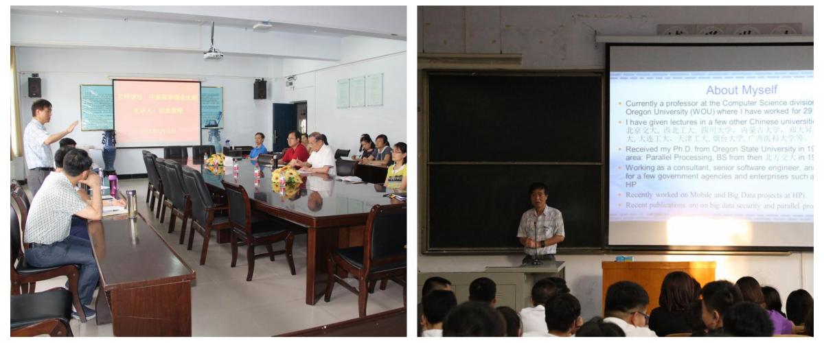 讲学期间,刘杰教授为我校信息工程学院网络工程专业的学生讲授了《大数据应用导论》课程。授课中,刘杰教授将理论与实践相结合,采用严谨的教学设计、基于问题的教学方法与基于过程的考核方法充分调动了学生学习的积极性,使学生在了解大数据理论知识的同时掌握了大数据相关实践能力。刘教授先进的教学理念使听课教师、学生充分领会了中美专业教学的特点,较好地培养了学生国际化视野,也给教师的课堂教学提供了可借鉴的思想和方法,有效地推进网络工程专业卓越工程师的认证工作。