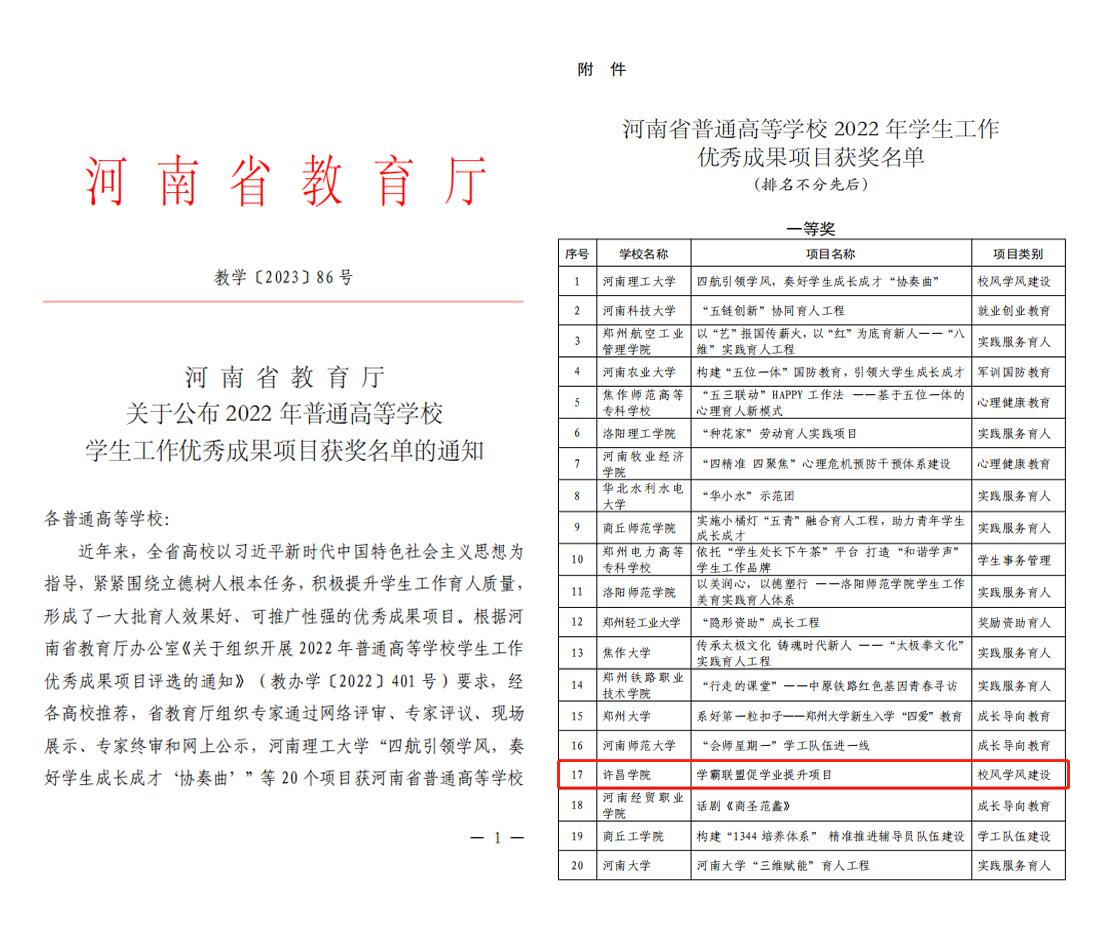 近日,2022年河南省普通高等学校学生工作优秀成果项目评选结果揭晓,我校党委学生工作部组织申报的“学霸联盟促学业提升项目”获一等奖。