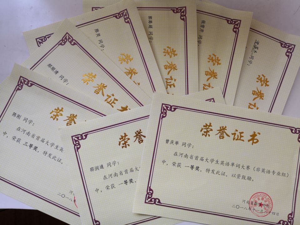 11月24日,由河南省翻译协会举办、黄河科技学院承办的河南省首届单词大赛决赛在黄河科技学院举行,本次大赛吸引了省内130多所高校的近9万名学生报名参赛,最终来自44所学校的105名优秀学子成功晋级决赛。我校学生曾庆举、邵润通获得英语非专业组一等奖,沈英杰、陈刚、郝顺清、陈笑获得英语非专业组三等奖,郭路超、钱雪芹获得英语专业组三等奖。