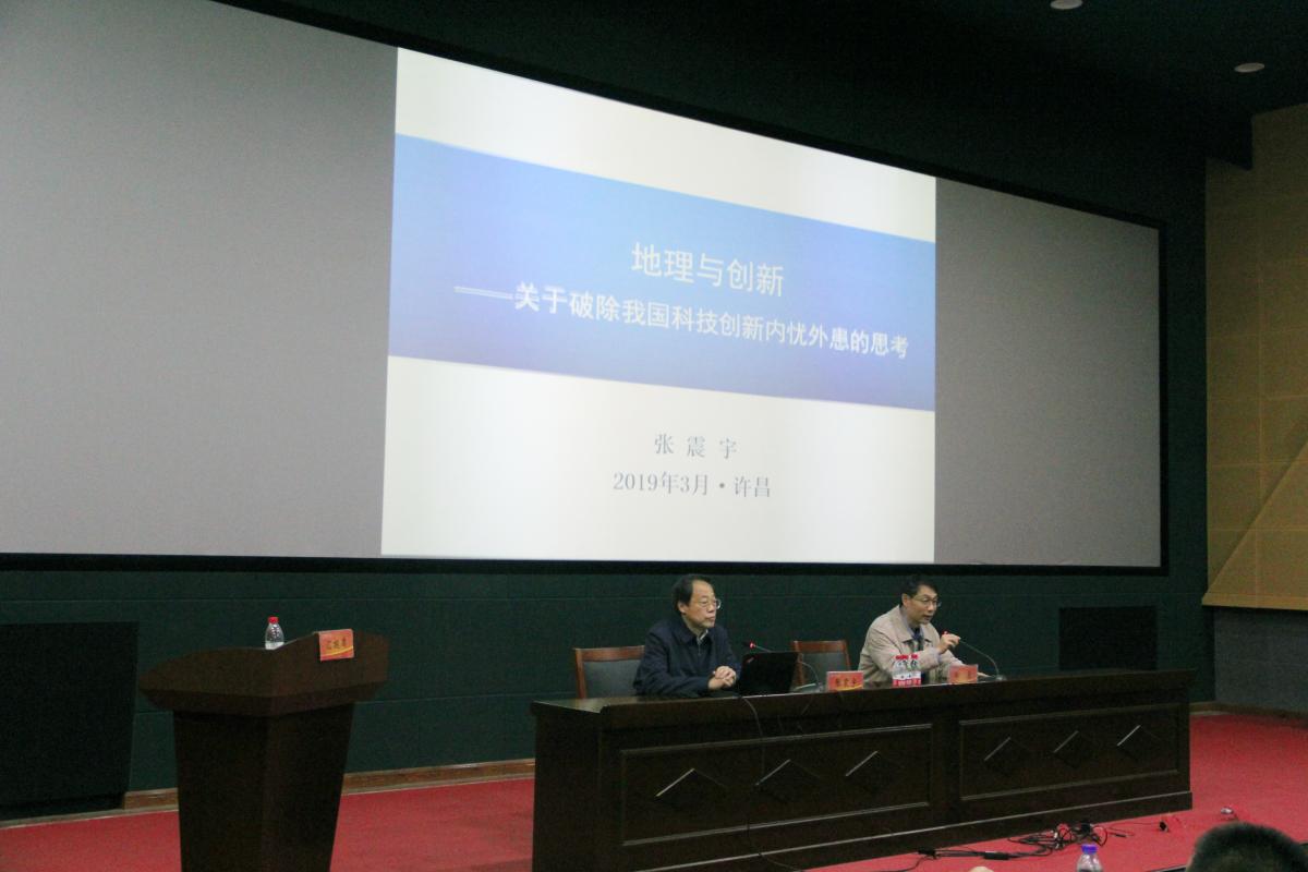 3月29日下午,全国政协常委、民进中央常委、河南省委主委、河南省政协副主席张震宇教授应邀到我校作了主题为《地理与创新——关于破除我国科技创新内忧外患的思考》的专题报告。我校信息工程学院、城乡规划与园林学院师生200余人听取报告。副院长郑直主持报告会。