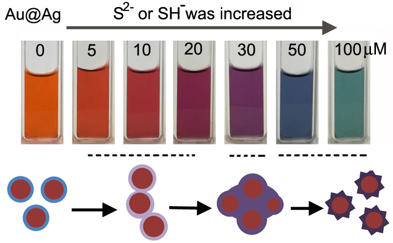含硫物种与金属纳米颗粒的特定相互作用会显著影响纳米材料的性质和功能,对该作用的认识引起了相关领域的研究兴趣。新材料与能源学院刘伟娟和李宗昌同学从大学二年级开始,跟随何伟伟老师开展本科生开放平台实践课程,选题着眼于研究无机硫离子与金属纳米颗粒的作用,他们以等离子体纳米结构Au@Ag为模型,研究了多种硫物种(S,SH-,S2-)与Ag之间的硫化反应。Au@Ag具有独特的光学性质,其表面结构和组分的微弱变化就能引起溶液颜色和光谱的巨大差异。借此现象,可实现对硫和Ag纳米颗粒化学反应动力学行为的光学监测。他们发现硫物种可以引起Au@Ag到Au@Ag2S的快速转变,硫化程度不同伴随着可调控的表面等离子体共振吸收和颜色产生。此外,SPR最大波长或吸光度与硫物种的添加浓度之间具有线性关系,进而可实现对硫离子的快速可视化检测。该方法对硫粉和硫化物(S,SH-,S2-)的检测具有高灵敏度和选择性。由于硫物种和金属纳米颗粒广泛用于生物和环境相关体系,这些结果可为金属纳米颗粒和含硫分子的组合寻找新应用。