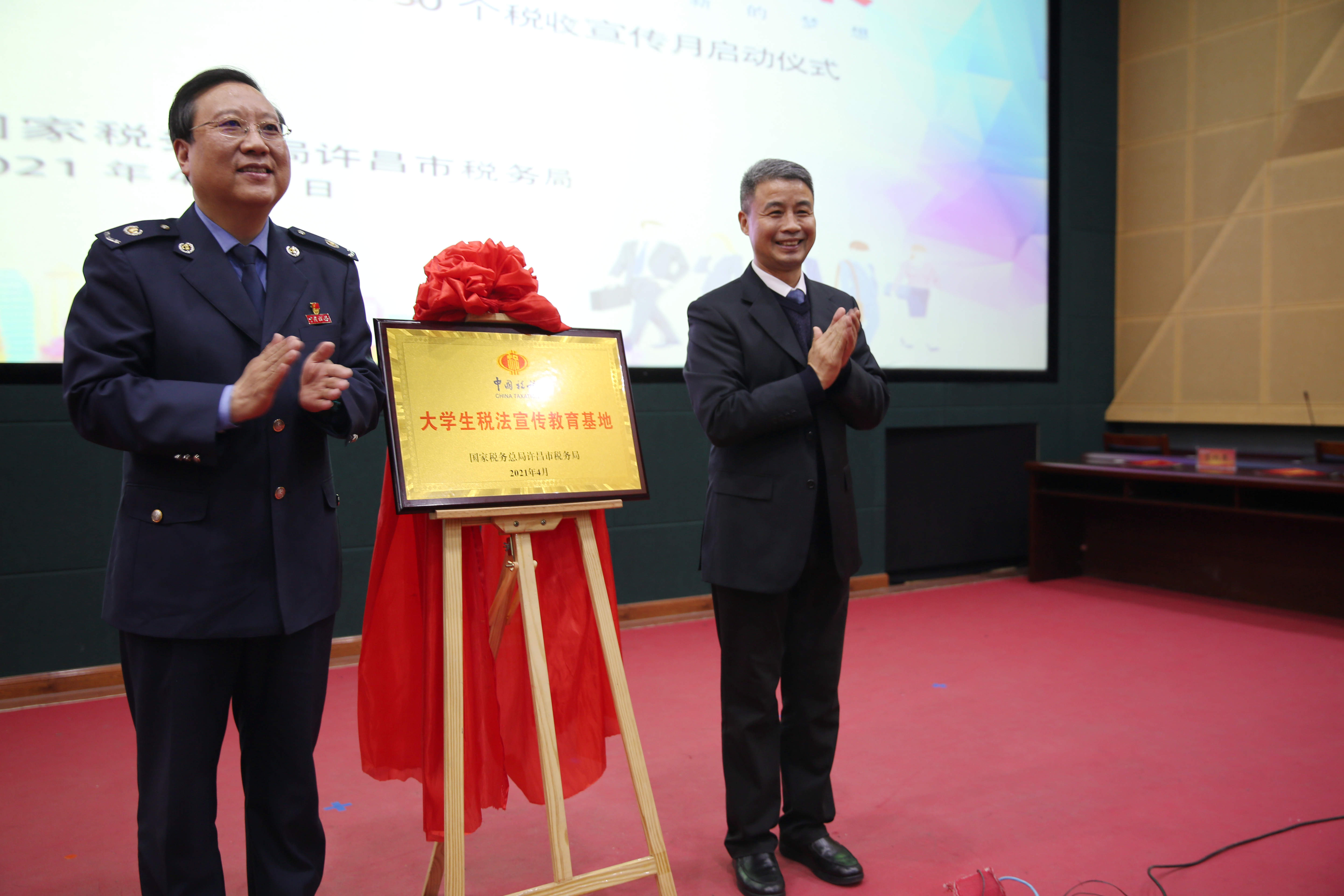 仪式上,许昌学院院长岳修峰、许昌市税务局局长宋彬共同为“大学生税法宣传教育基地”揭牌。