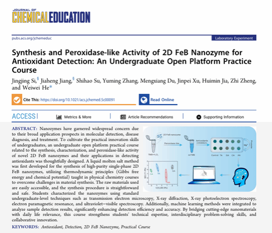 纳米酶在众多领域的应用潜力备受瞩目,如何将前沿科研成果转化为本科生实践教学内容,是培养本科生创新人才面临的重要课题。我校纳米催化材料与应用团队何伟伟教授带领团队成员以我校首创的开放实践创新教育(OPCE)理念为基石,为本科生量身定制了一门关于新型二维硼化铁(2D FeB)纳米酶的合成、表征、过氧化物酶样(POD)活性及其在抗氧化剂检测中的应用的开放平台实践课程。该工作第一作者为化工与材料学院司晶晶博士和2023级联合培养硕士研究生蒋家恒(我校2019级本科生),2022级本科生苏世豪,2022级本科生张煜铭,2021级本科生杜梦想和2023级本科生徐金沛为本论文作者,通讯作者为何伟伟教授。