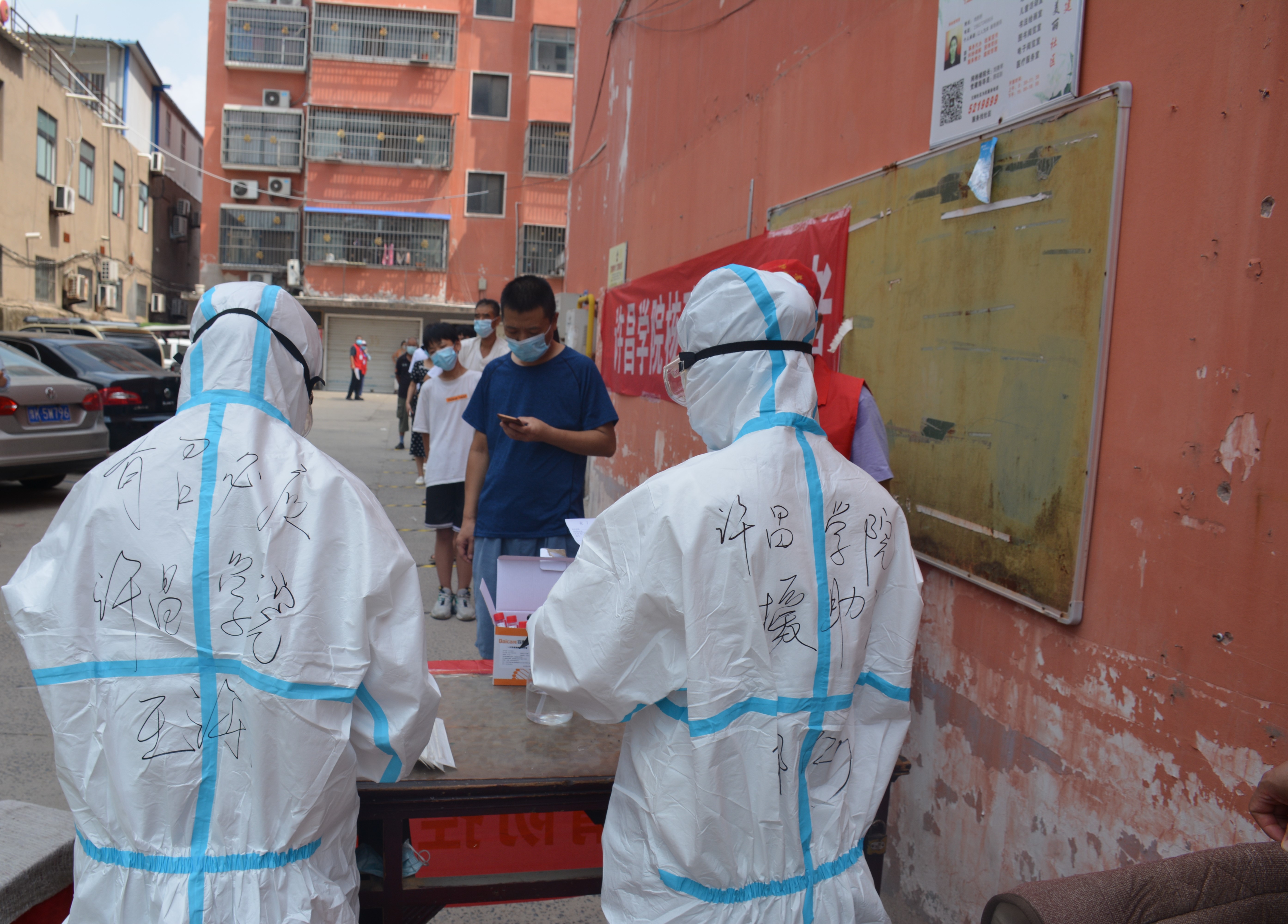 9时许,志愿者服务队先期抵达许由街道办事处文翰社区兴昌小区,迅速对接理顺工作流程。在进行核酸采样操作规范、穿脱防护服、采样信息录入等强化培训后,志愿者们换上密闭防护服迅速投入工作,消毒、采样、拭子装管……有条不紊,配合默契。全体志愿者充分发挥不怕苦、不怕累的精神,用实际行动践行医者初心,为打赢疫情防控阻击战作出应有的贡献。