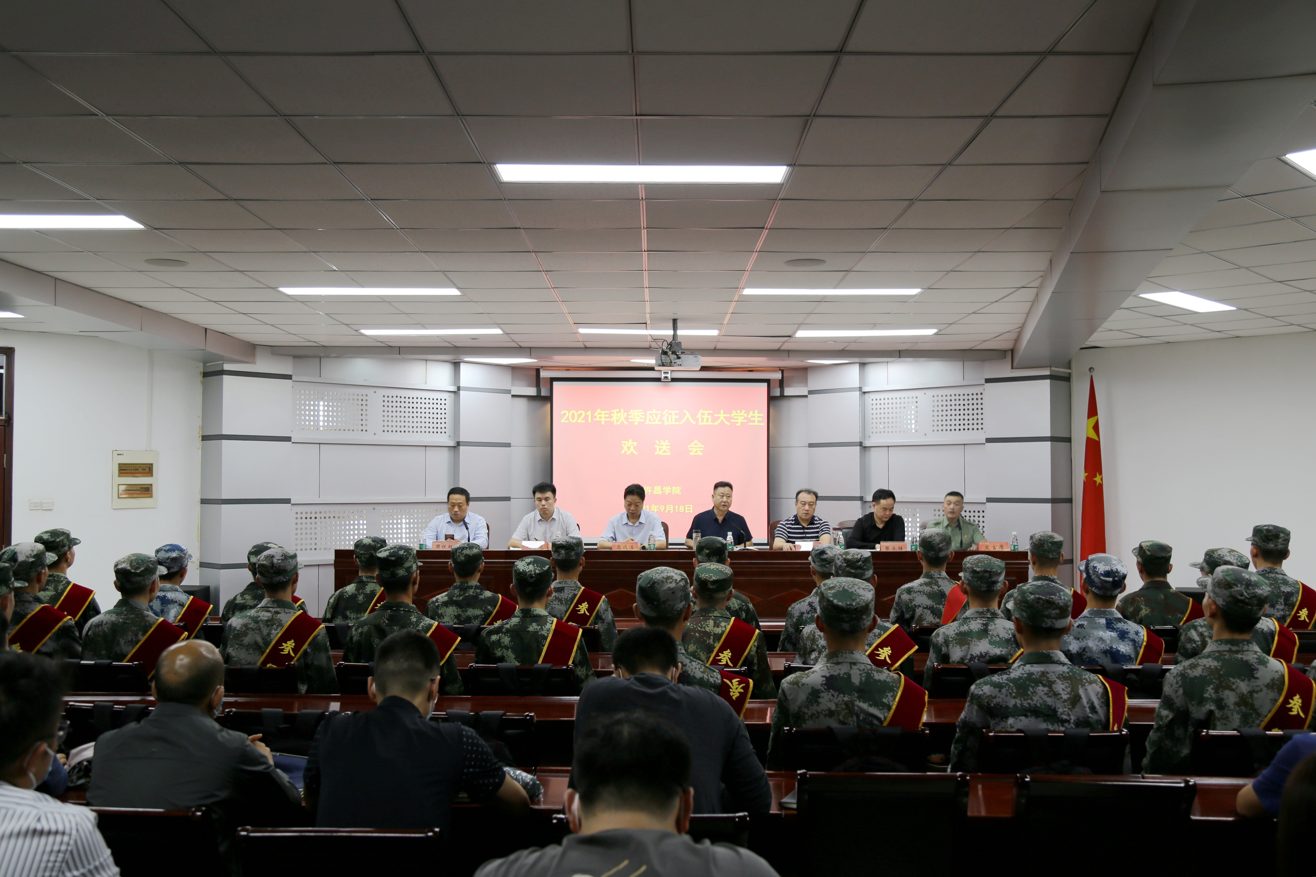9月18日下午,我校2021年秋季应征入伍大学生欢送会在办公楼第三会议室举行。校党委副书记孙海出席会议并讲话,党委宣传部、人民武装部、团委、教务处、招生就业处等部门负责同志及各二级学院党委副书记、征兵干事和应征入伍大学生近80人参加了会议。会议由人民武装部部长周银超主持。