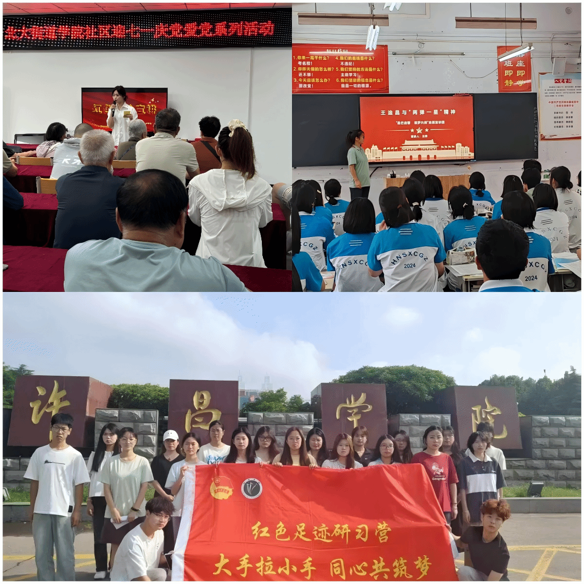 马克思主义学院“星芒启智,核梦兴邦”志愿宣讲团联合博物馆、科技馆、学校、烈士陵园等单位,通过“故事讲述+多媒体展示+互动环节”等形式,深入周边社区开展理论宣讲10余场,通过讲述科研工作者事迹、解读科学家精神内涵,激发听众爱国热情与奋斗精神。教育学院“青年说中华”实践队走进建安区幼儿园、许昌市实验小学等地,依托交叉学科优势,以“红色教育+多元成长”模式,通过讲述红色故事、传授心理知识、开展科学实验等形式,将红色教育与儿童多元成长相结合,让红色基因在青少年心中扎根。地理与空间信息学院“红色足迹”研习营社会实践队,以“大手拉小手,同心共筑梦”为理念,携手少先队员前往许昌革命烈士纪念馆、朱瑞故居、雷岗战役纪念馆、小李庄革命烈士纪念馆等红色教育基地,通过线下走访、材料收集、视频拍摄剪辑等形式,助力青少年了解家乡红色文化,传承红色基因。