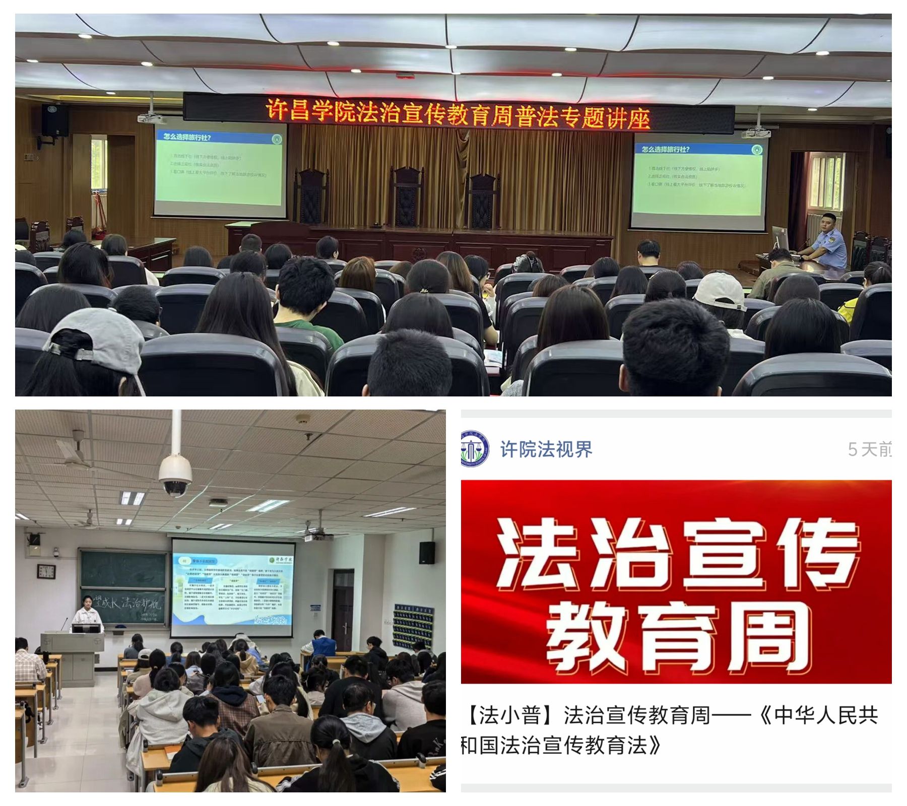 本次活动由学校法制办与法学院“法小普”学生普法教育辅导员工作室联合举办。活动通过线上平台推送系列法治宣传图文,以直观生动的形式普及法律知识,在潜移默化中增强学生“知法”意识,为后续深入“懂法、守法、用法”打下坚实基础;聚焦校园生活中常见的法律问题及青少年权益保护等内容,召开“守望成长 法治护航”主题班会,通过案例分析、观点交流等形式,提升学生“懂法于心、守法于行”的自觉,营造主动学法、积极探讨的良好氛围。宣传周期间,学校还特邀许昌市文化市场综合行政执法支队寇亚飞、法学院教师杨桂分别以“文化执法护青春”“自由不越界・保护不失声”为题开展专题讲座,通过“法条+案例”的生动讲解,引导学生明晰权利与义务,提升依法维权能力。学校将持续深化法治校园建设,引导广大学子以法为尺、以律为纲,在青春征程中坚守法治信仰,践行法治精神。(图片由法制办公室提供)