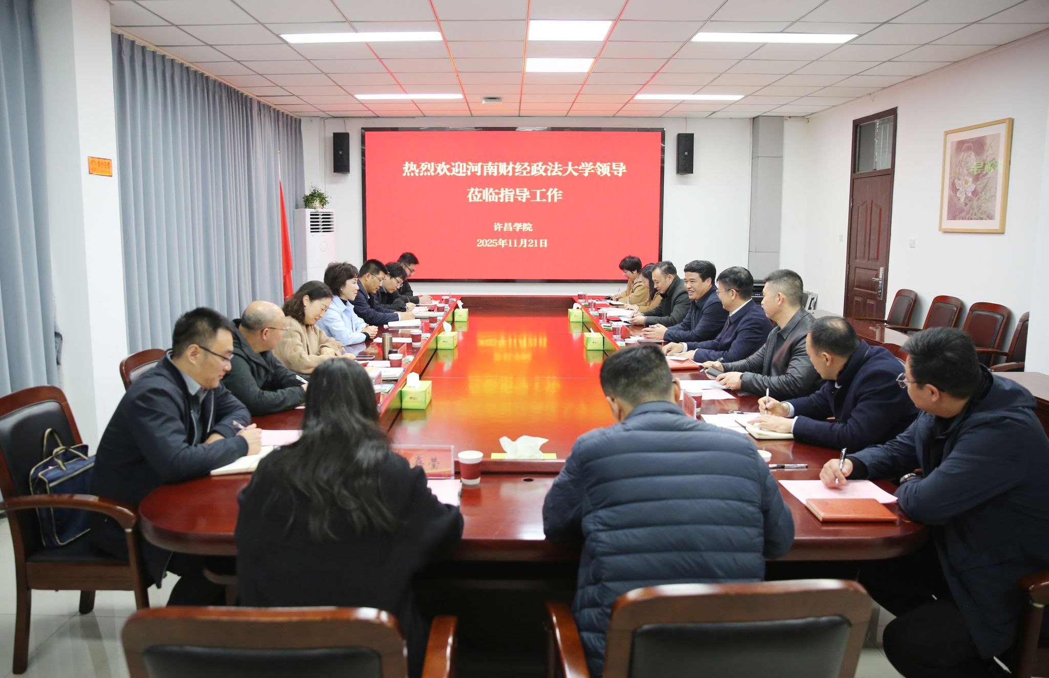 11月21日上午,河南财经政法大学党委副书记高京燕一行到我校考察交流。我校在办公楼第四会议室举行交流座谈会。校党委书记刘荣增,党委副书记、工会主席梁予昉出席座谈会。会议由梁予昉主持。