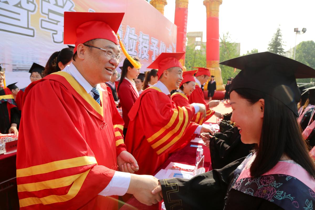 6月12日上午,我校在弘毅广场举行2019届毕业典礼暨学位授予仪式。5452名2019届本科毕业生被授予学士学位。胡康等134名同学被授予省级优秀毕业生荣誉称号,丁畅等654名同学被评为校级优秀毕业生,另有388名考取硕士研究生的学生受到表彰。党委书记闫纪建、院长岳修峰等学校领导和学校学士学位评定委员会委员,为毕业生授予学位证书,并为他们拨穗正冠。