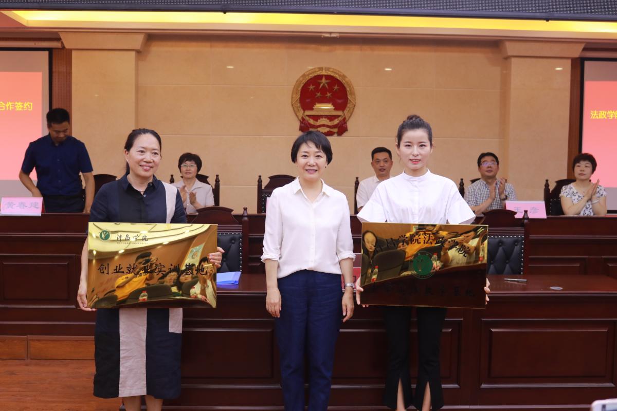 副院长黄怡俐对河南天苑律师事务所进行“创业就业实训基地”“法学实践教学基地”授牌。(图片由法政学院提供)