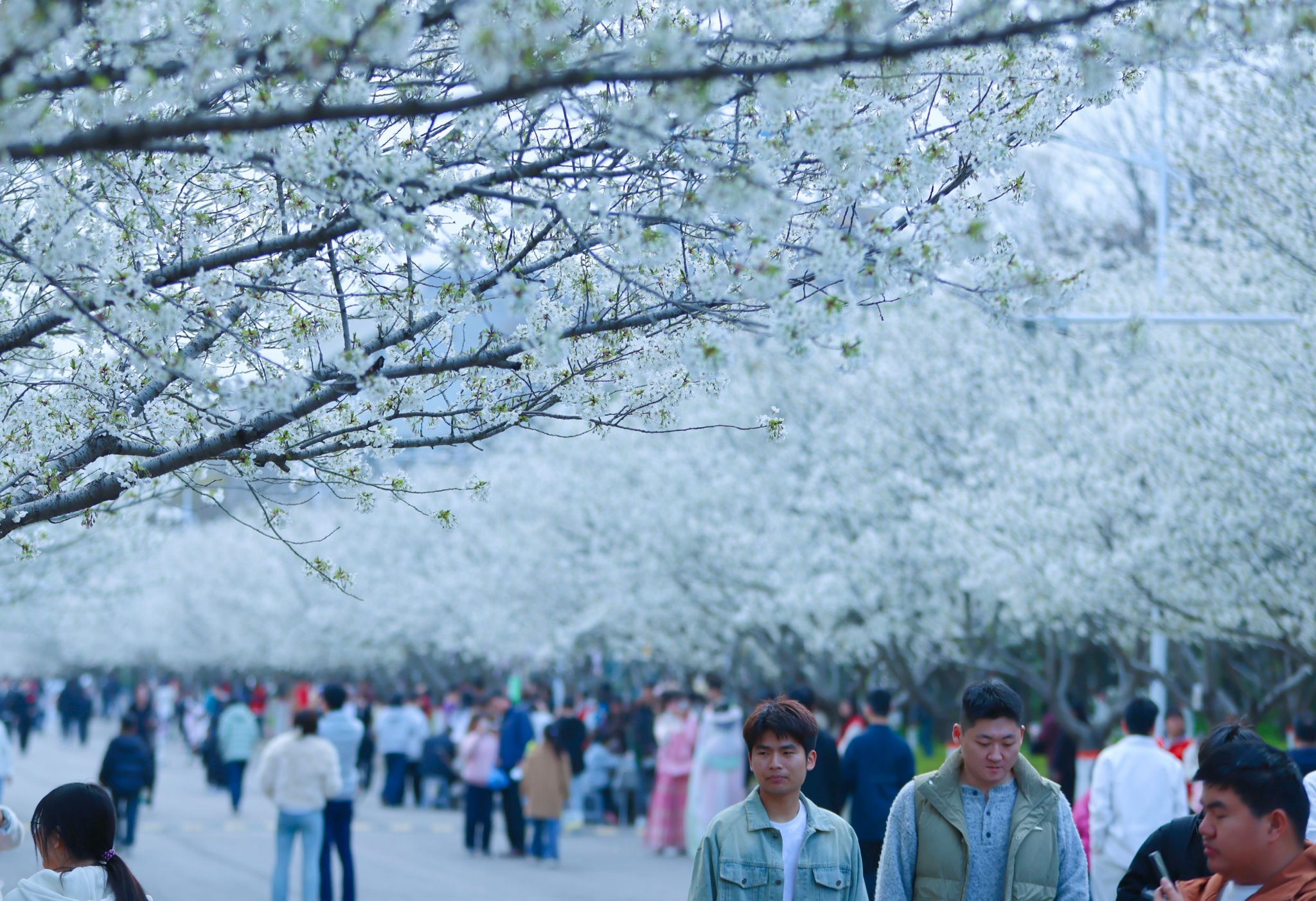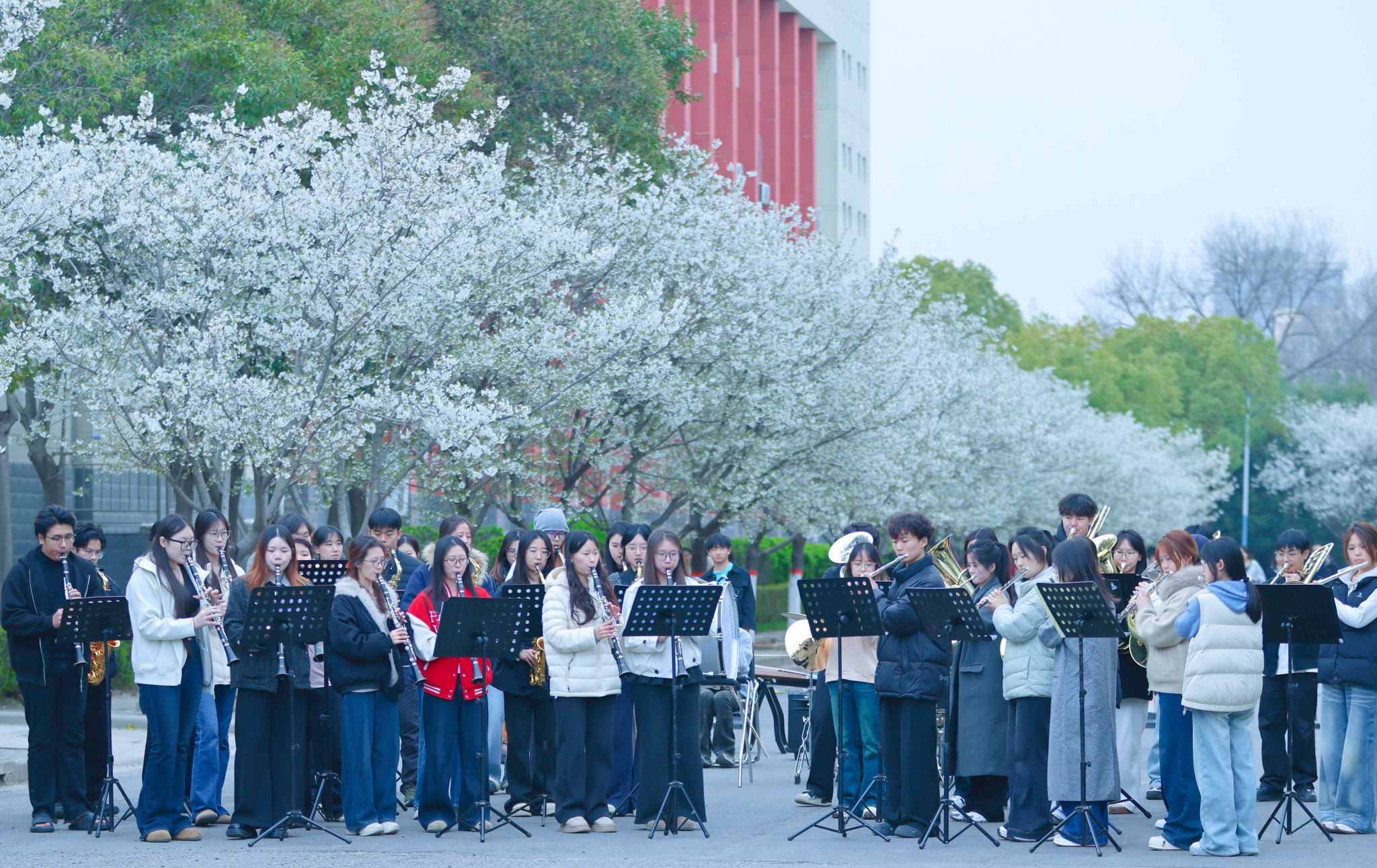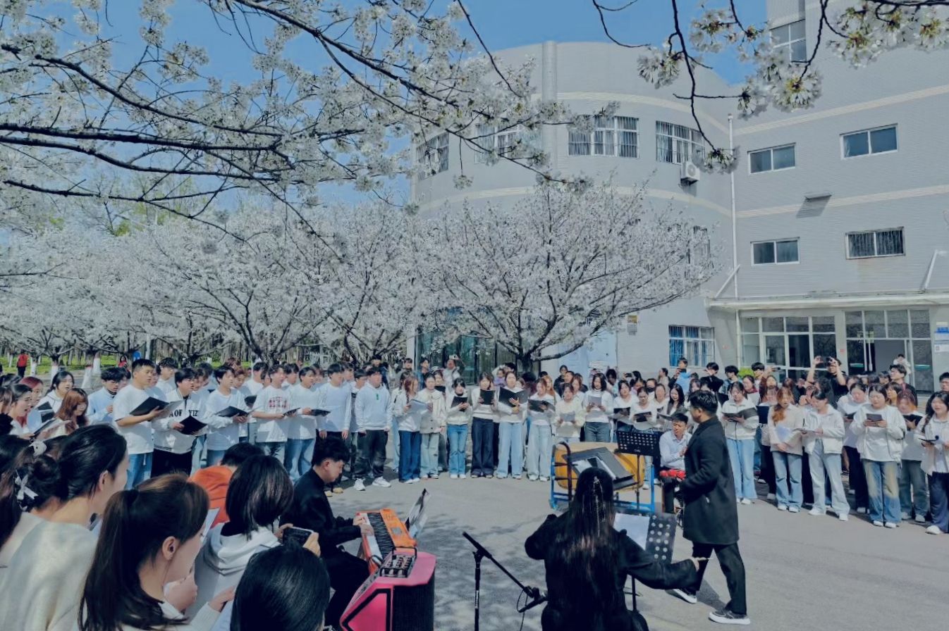 花树下,音乐舞蹈学院弘毅合唱团以《看山水看中国》《无衣》《咱们说说知心话》等曲目,为观众带来一场听觉盛宴。民乐古韵悠长、豫剧铿锵有力、合唱和谐共鸣,多种艺术形式交织呈现,令人沉醉其中。同学们还身着汉唐古典舞、民族舞等服饰,在繁花间翩跹起舞。音乐舞蹈学院李乐老师介绍:“这些踏歌类舞蹈与春日花景相映,同学们在自然与艺术的交融中感受中华传统乐舞之美,本身也是一次沉浸式的美育实践。”
