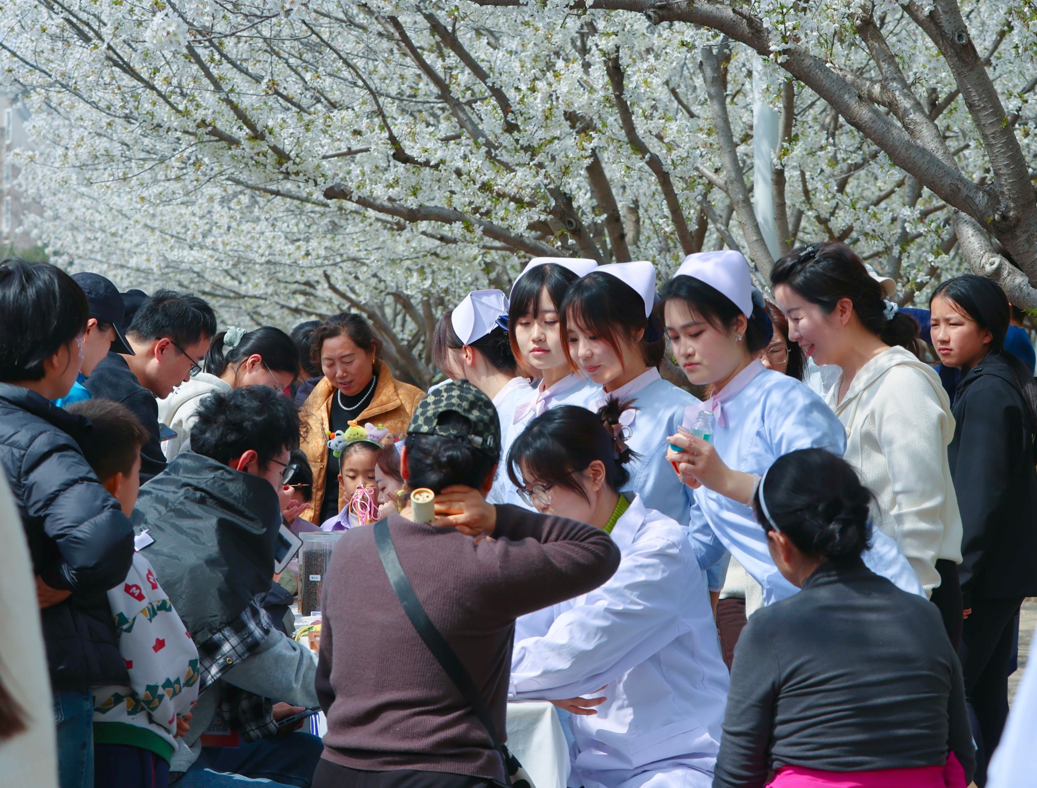 医学院学子利用所学的传统中医药文化,为“春日花潮”增添了一抹独特的本草芬芳。活动现场,把脉问诊、艾灸理疗、耳穴贴压等传统中医服务项目有序开展,中药手串、经络锤、香囊等文创产品更是备受青睐。广大师生在亲身体验中,近距离感受中医药文化的深厚魅力。医学院团委书记姚婷玉表示:“这个活动主要依托‘青许岐黄 医润莲城’文明实践项目,初衷就是为广大师生提供贴心的健康服务。”