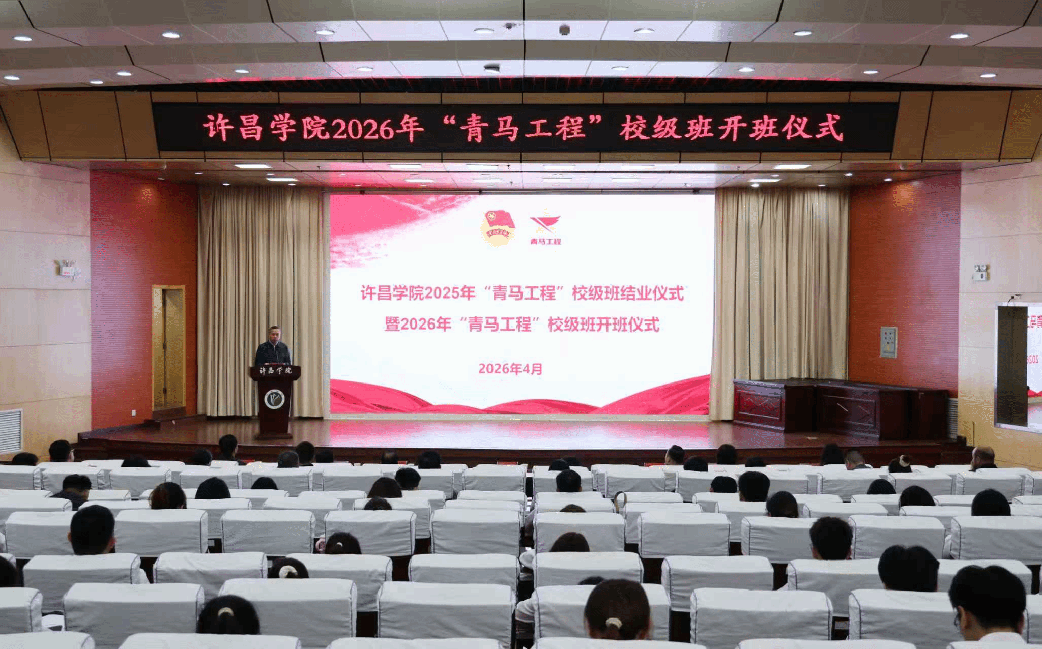 4月16日下午,我校在图书馆学术报告厅举办2025年“青马工程”校级班结业仪式暨2026年“青马工程”校级班开班仪式。校党委副书记杜根远出席活动并为2026年校青马班授旗。各二级学院(社区)党委副书记、团委负责人,校团委全体工作人员、青马班授课教师代表及校青马班全体学员共150余人参加活动。