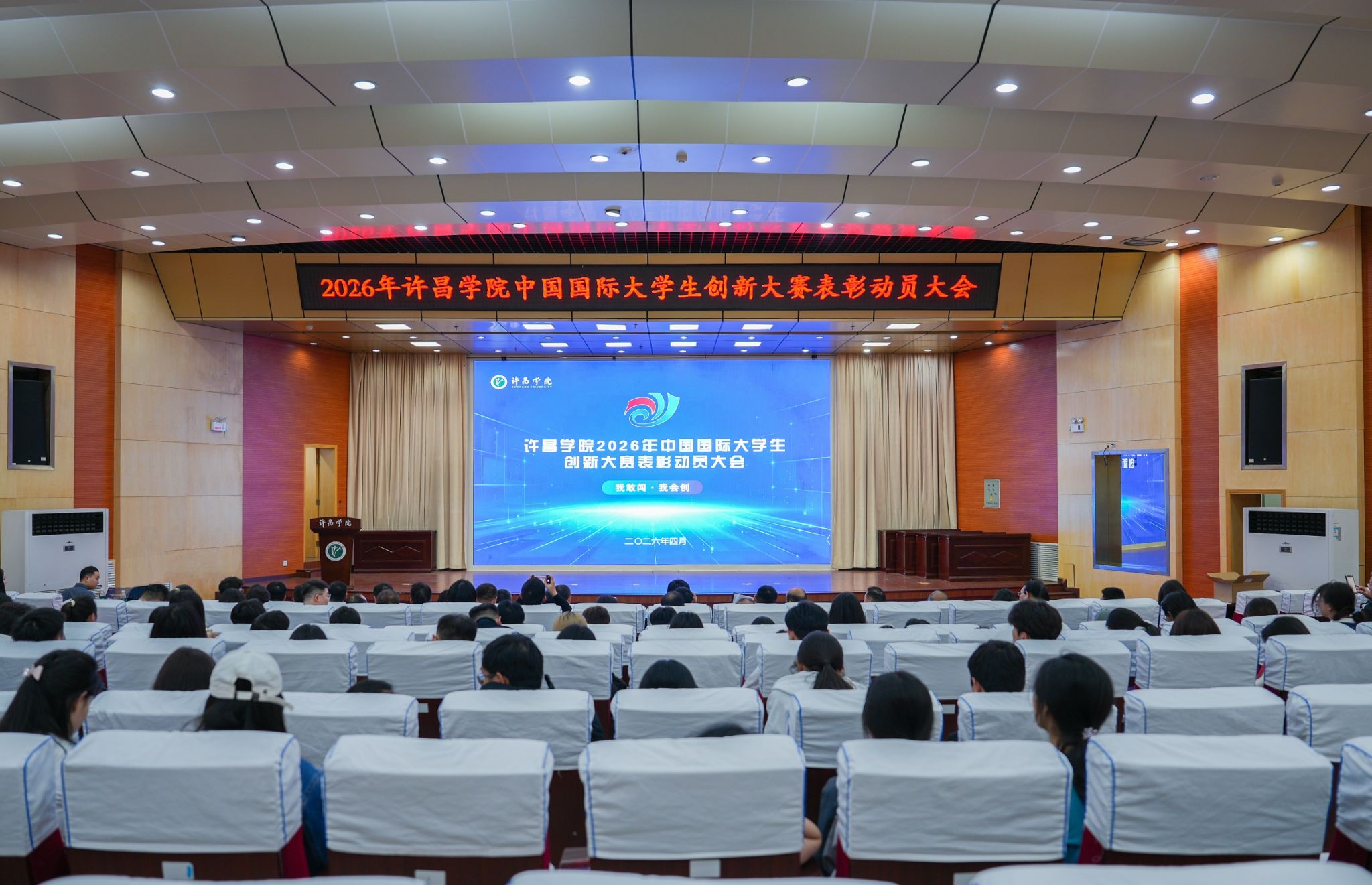 4月28日下午,我校在图书馆二楼学术报告厅召开许昌学院2026年中国国际大学生创新大赛表彰动员大会,校长郑直、副校长王景涛出席会议并讲话。