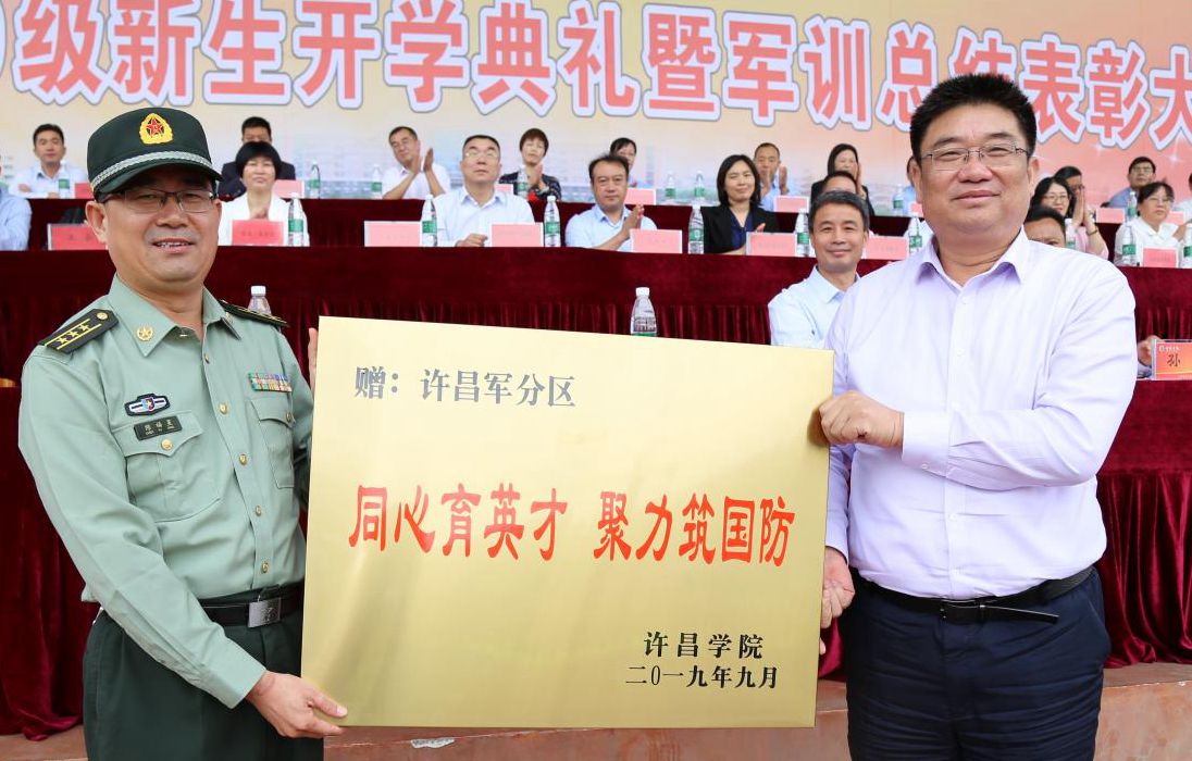 仪式上,党委书记闫纪建代表我校向许昌军分区赠送了“同心育英才,聚力筑国防”的纪念牌匾。