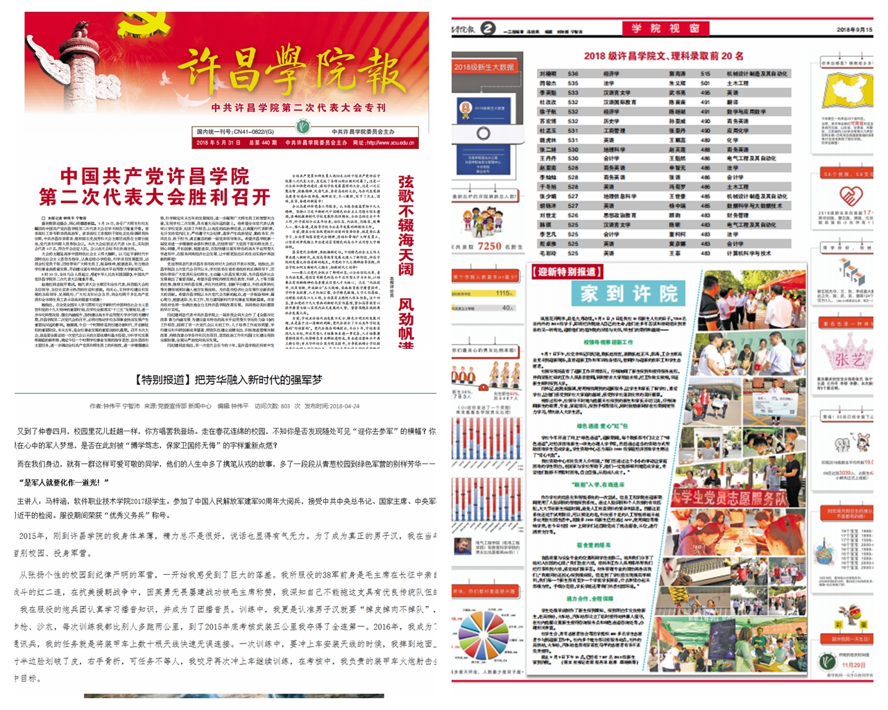 近日,中国高校校报协会公布了2019中国高校新闻奖获奖情况,在全国724所高校报送的3848篇参赛作品中,我校党委宣传部(新闻中心、校报编辑部)的《把芳华融进新时代的强军梦》(钟伟平 宁智沛)《弦歌不辍海天阔 风劲帆满踏新程》(冯晓民 宁智沛)和《许昌学院报·迎新专刊》分别荣获通讯类二等奖、言论类三等奖,版面类三等奖。