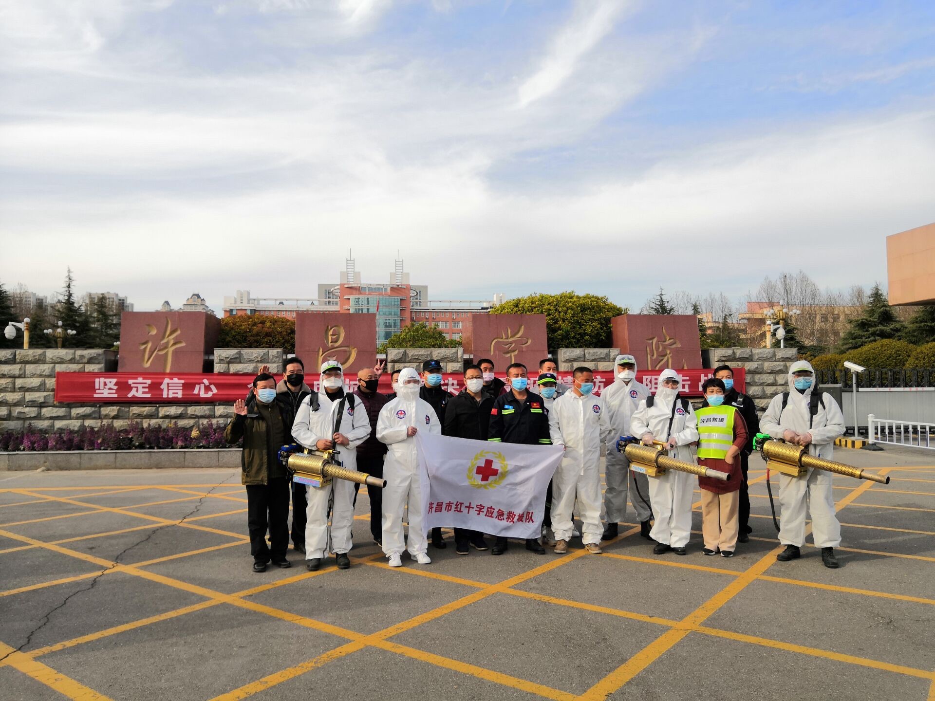 3月15日,许昌市红十字应急救援队一行15人携带专业防控消杀设备和消毒液来我校开展义务消杀工作。
