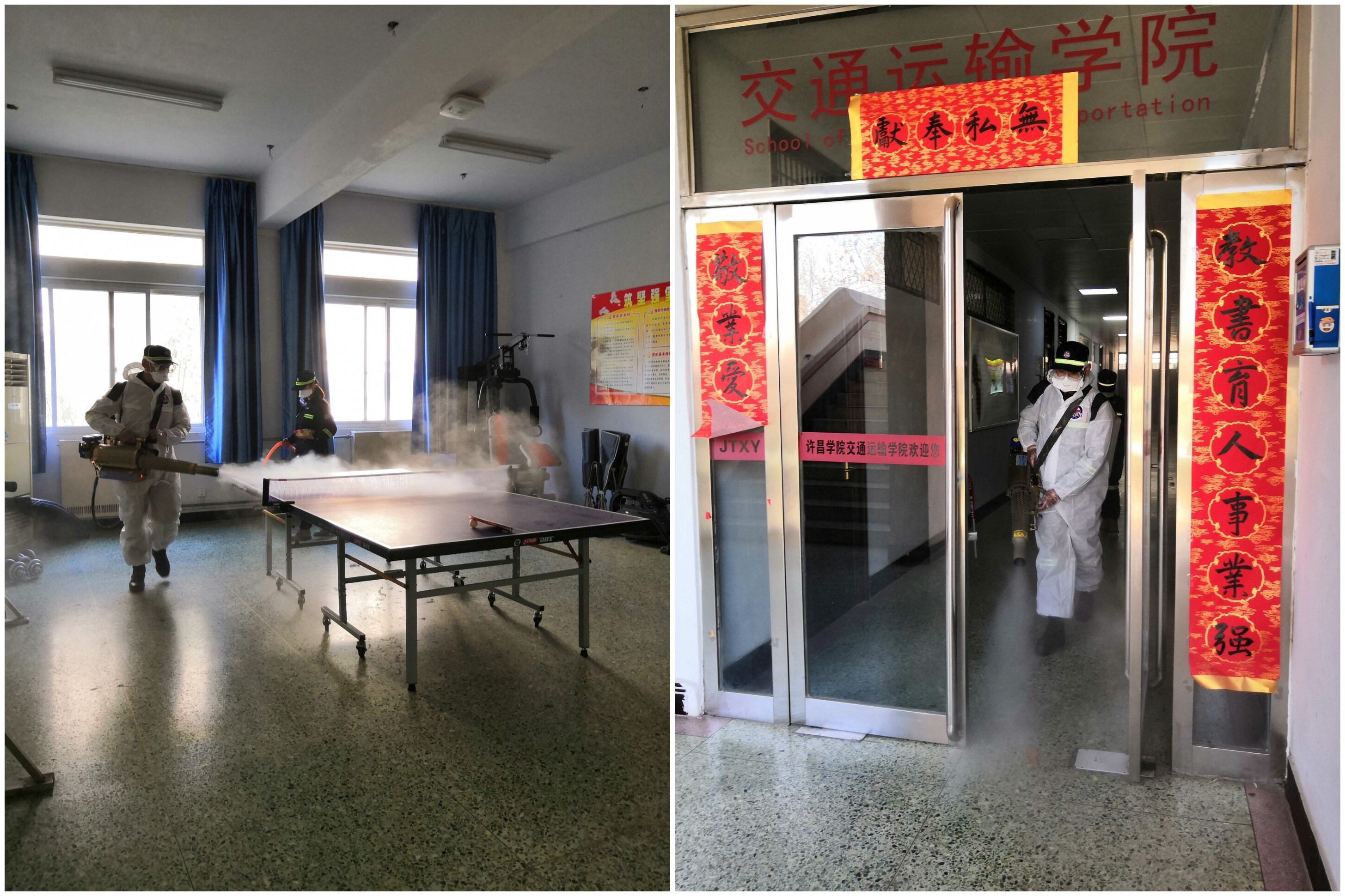 消杀过程中,救援队员们身穿防护服,利用专业设备,严格按照标准化规范作业。一整天的时间里应急救援队员对全校所有办公楼、教学楼、餐厅、15栋学生公寓及部分道路、车棚、垃圾桶等进行了全方位、专业化、无死角的消杀,消毒面积达十万多平方米。我校防疫消毒消杀小组成员对消杀现场进行观摩学习。市红十字田豪彬主任和高煜队长分别围绕消杀设备的使用、药物配比、个人防护、重点部位消杀及注意事项进行了培训讲解。