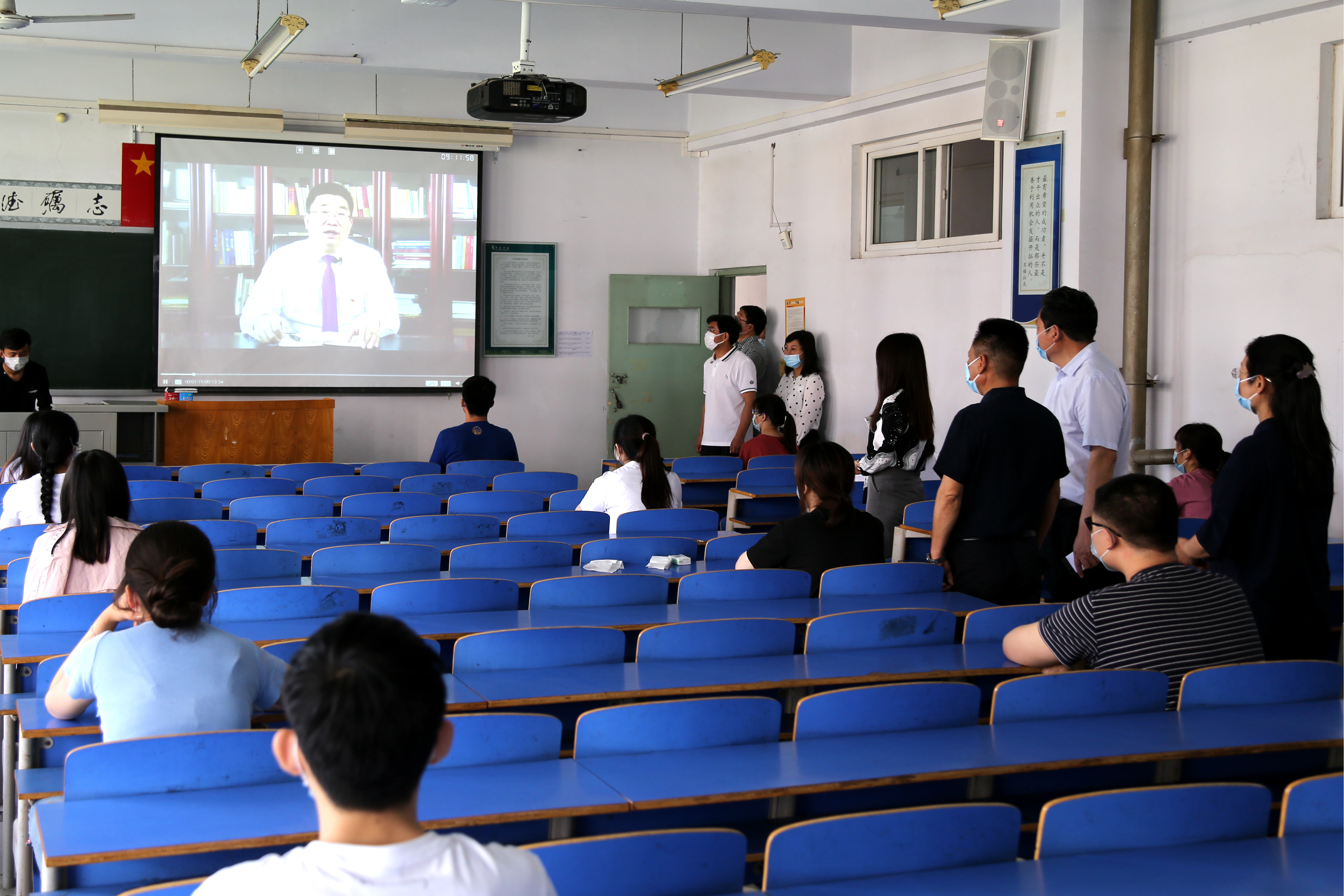 党委书记闫纪建通过视频向全体学生表示了美好祝愿。闫书记围绕全国、河南省和学校新型冠状病毒感染的肺炎疫情形势,强调了关键时刻各级党组织战斗堡垒和共产党员的模范带头作用,进一步坚定师生战胜疫情的信心和决心。院长岳修峰通过视频对同学们返回课堂表示了热烈欢迎。岳院长简要介绍了学校在抗击疫情和组织教学上的各种举措,并围绕学校整体工作、学生管理、延期复学教学等,向同学们介绍了学校复学整体工作的安排部署情况。副院长高金星介绍了学校疫情防控安排和具体措施,强调疫情防控警报一天不解除,防控工作一刻不放松,要确保师生生命安全和身体健康,确保学校安全稳定。