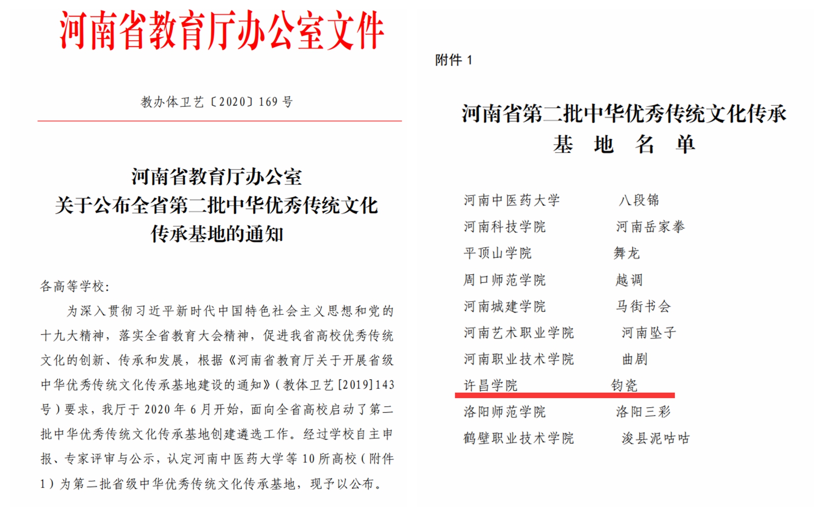 近日,河南省教育厅发布了《关于公布全省第二批中华优秀传统文化传承基地的通知》(教办体卫艺〔2020〕169号),我校申报的“钧瓷”获批河南省第二批中华优秀传统文化传承基地。