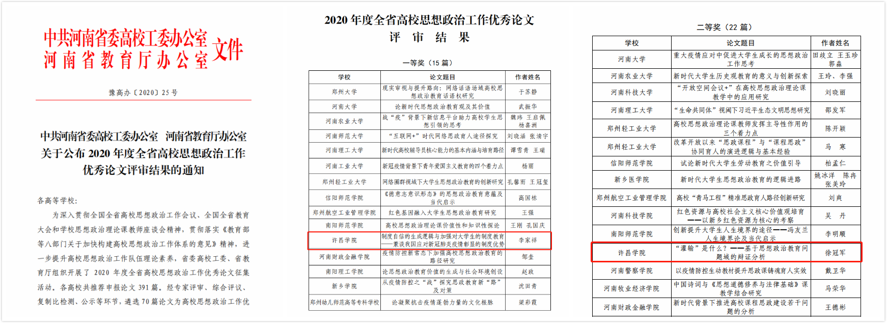 近日,中共河南省委高校工委、河南省教育厅下发《关于公布2020年度全省高校思想政治工作优秀论文评审结果的通知》。我校马克思主义学院教师李家祥撰写的《制度自信的生成逻辑与加强对大学生的制度教育——兼谈我国应对新冠肺炎疫情彰显的制度优势》荣获一等奖, 马克思主义学院教师徐冠军撰写的《“灌输”是什么?——基于思想政治教育问题域的辩证分析》荣获二等奖。