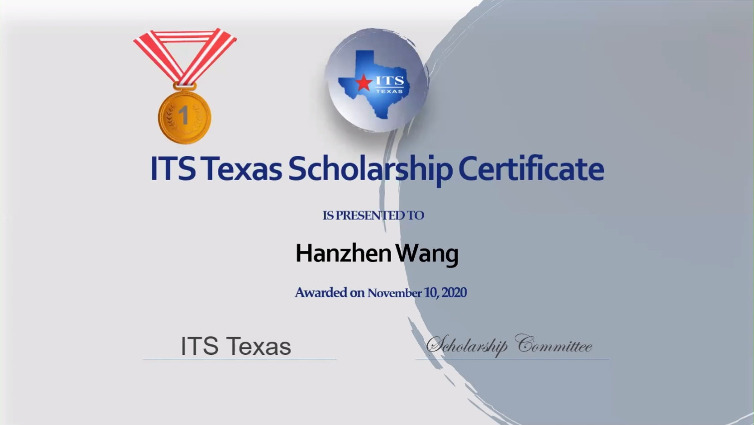 “得克萨斯州智能交通协会奖学金”是美国“得克萨斯州智能交通协会”(ITS Texas)每年面向智能交通相关领域研究生的奖学金项目,旨在鼓励他们为智能交通的研究和实践做出贡献。王翰禛由美国得克萨斯南方大学教授和休斯顿大学教授联合推荐,并经得克萨斯州智能交通协会奖学金评定委员会的严格筛选,在众多美国硕士和博士研究生申请者中脱颖而出,荣获一等奖。