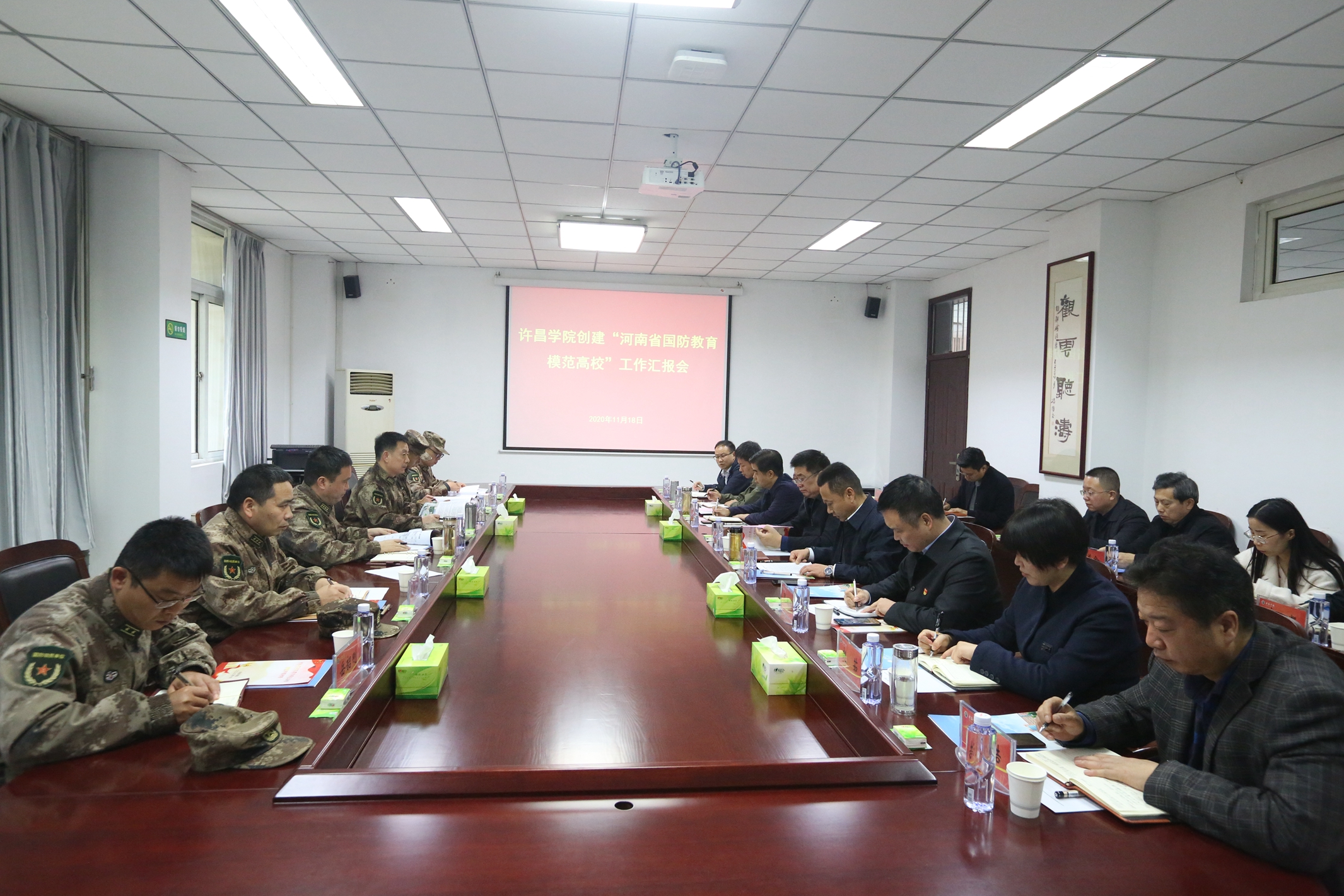 11月18日,我校在办公楼第一会议室召开创建“河南省国防教育模范高校”工作汇报会。许昌军分区司令员李选才、副司令员杨鸿章、政治工作处主任牛听甫,魏都区人民武装部政委聂广军,许昌学院党委书记闫纪建、党委副书记孙海出席会议,我校创建工作领导小组全体成员参加会议。会议由党委副书记孙海主持。