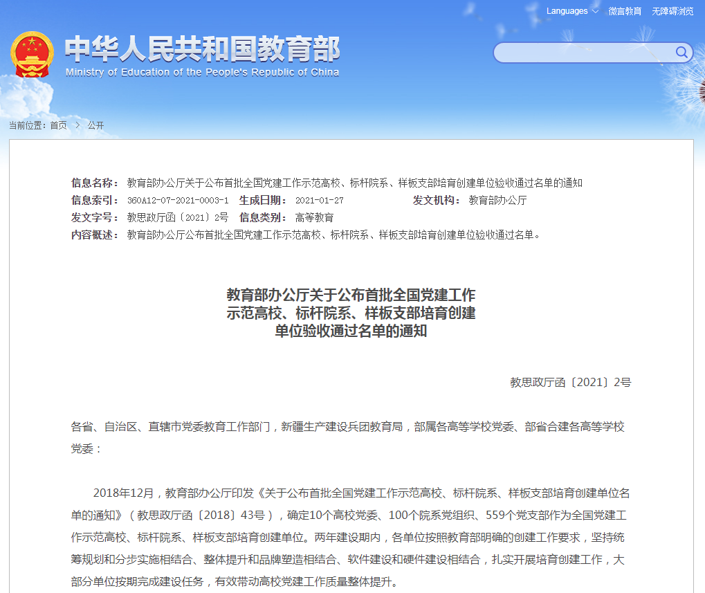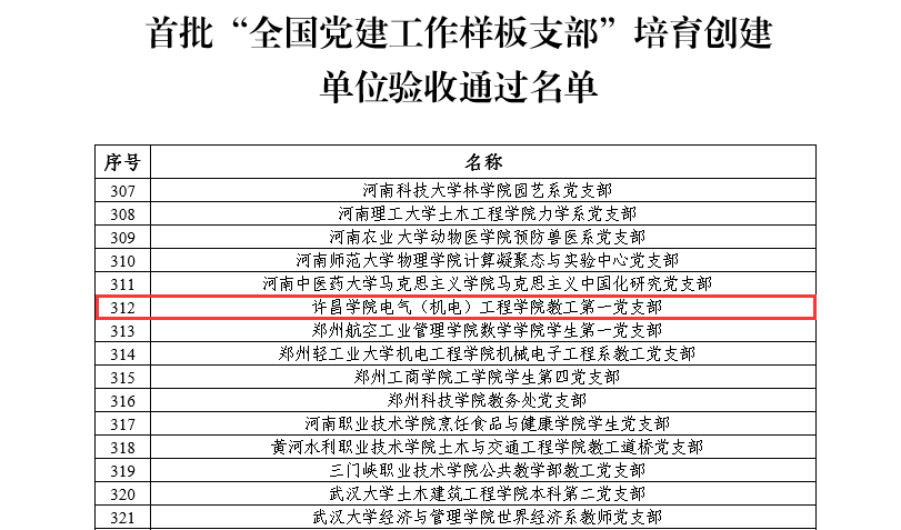 近日,教育部办公厅印发《关于公布首批全国党建工作示范高校、标杆院系、样板支部培育创建单位验收通过名单的通知》(教思政厅函〔2021〕2号),我校电气与机械工程学院教工第一党支部顺利通过样板支部验收。