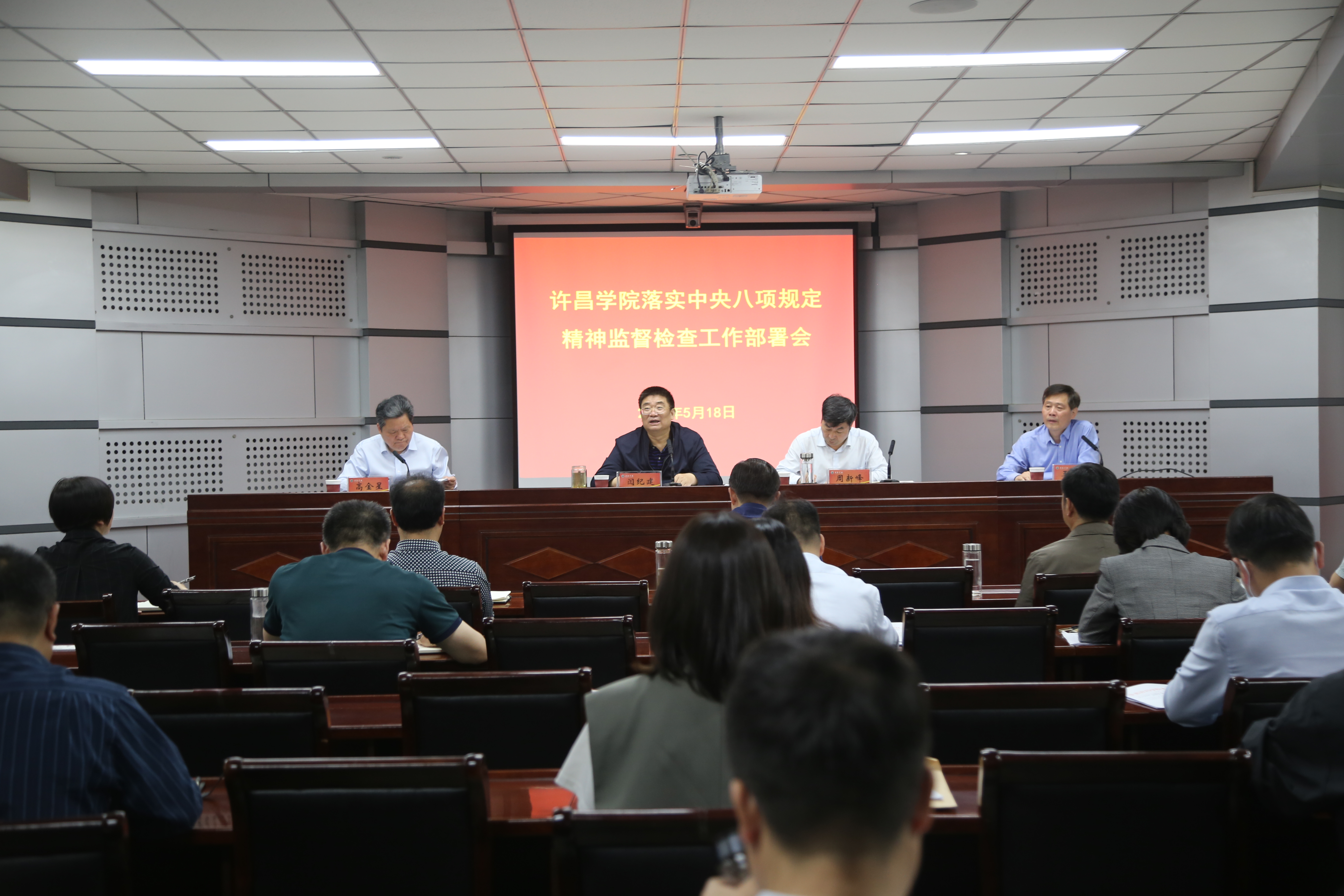 5月18日下午,我校在办公楼第三会议室召开落实中央八项规定精神监督检查工作部署会,贯彻落实上级有关要求,安排学校2021年“落实中央八项规定精神”监督检查相关工作。校党委书记闫纪建,副院长周新峰、高金星,纪委书记王东晓出席会议。各基层党委、直属党支部负责人,各职能部门主要负责人参与会议。会议由纪委书记王东晓主持。