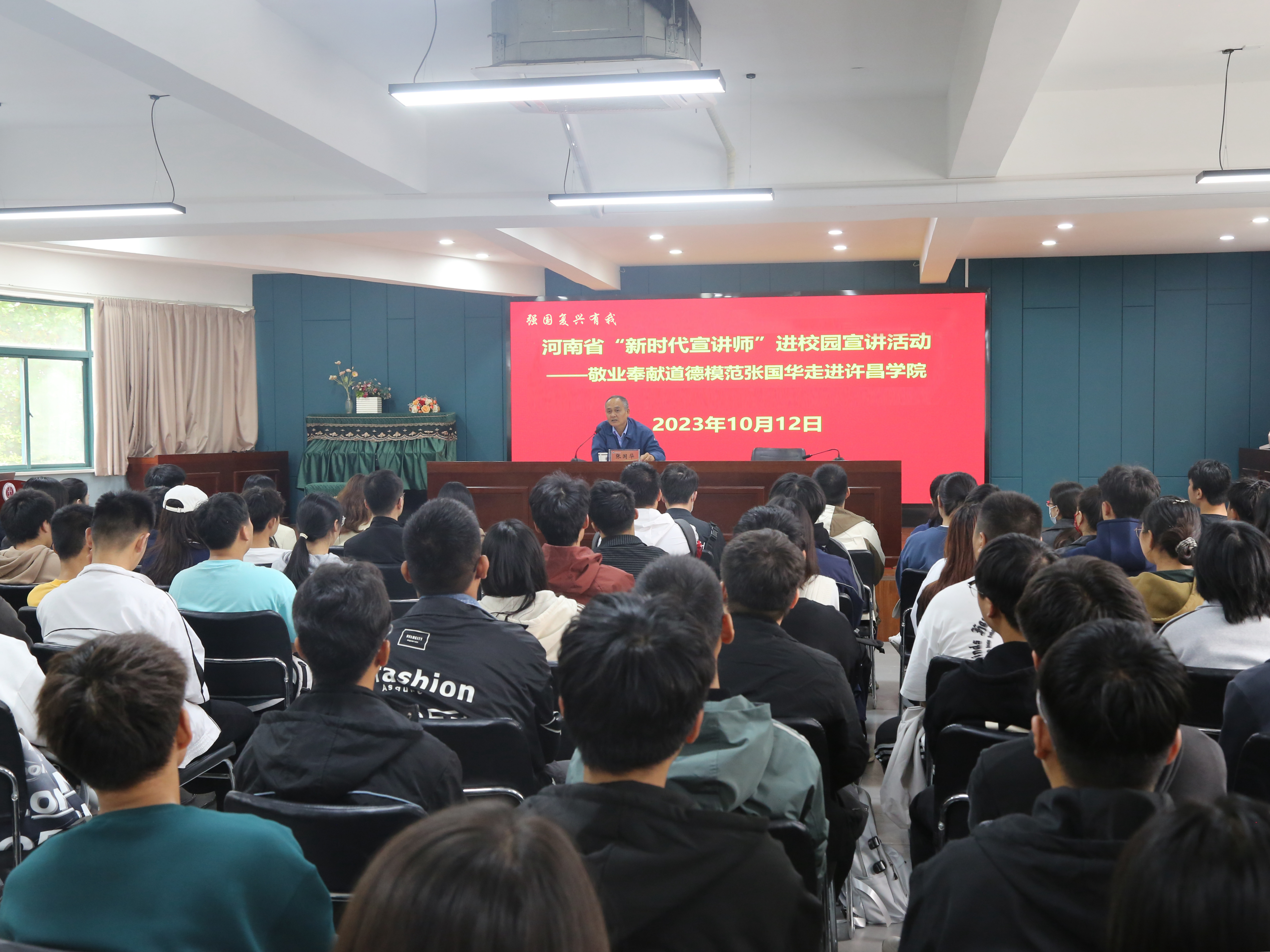 10月12日上午,河南省“新时代宣讲师”走进许昌学院宣讲活动在弘毅书院二楼报告厅举行,敬业奉献道德模范张国华应邀作先进事迹宣讲报告。我校全体新进教职工、弘毅书院大一新生150余人聆听报告会。
