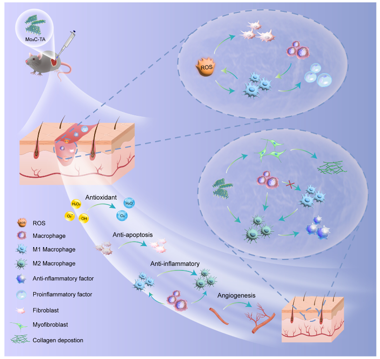 作为一类具有天然酶活性特征的纳米材料,纳米酶在调控活性氧产生与清除方面具有独特优势,并展示出抗氧化与抗炎等生物活性。我校纳米催化材料与应用团队聚焦纳米酶催化材料设计及其生物医学应用研究,在抗菌(Nano Today, 2023, 52, 101989;Appl. Catal. B: Environ., 2021, 295, 120317)、肺纤维化和帕金森疾病治疗(ACS Nano 2023, 17, 22, 22527;Nano Today, 2021, 36, 101027.)、生物检测(Food Chemistry, 2024, 445, 138788; J Colloid Interf. Sci., 2022, 618, 11;ACS Sustain. Chem. Eng, 2021, 9, 569.)领域取得了系列进展。为解决上述问题,我校何伟伟教授和国科大温州研究院周云龙研究员课题组合作,采用绿色、高效、安全的湿法刻蚀和插层剥离法得到了具有丰富表面官能团、大量Mo空位以及混合Mo价的二维超薄碳化钼(Mo2C)MXene纳米片(NSs)。独特的结构使 Mo2C NSs不仅能够清除活性氧物种和活性氮物种,具有广谱、高效的抗氧化能力,还能模拟过氧化氢酶促进O2产生,表现出良好的生物学效应和多重抗氧化途径。他们构建了糖尿病伤口模型,通过体内和体外实验证明了Mo2C NSs能够有效缓解氧化应激、激活巨噬细胞向M2 表型极化、减轻炎症反应、抑制细胞凋亡以及促进细胞增殖、迁移和血管生成,最终实现了糖尿病创面的快速愈合(图1)。该工作为开发多功能抗氧化纳米材料,加速糖尿病伤口愈合和治疗ROS相关的疾病方面提供了新策略。