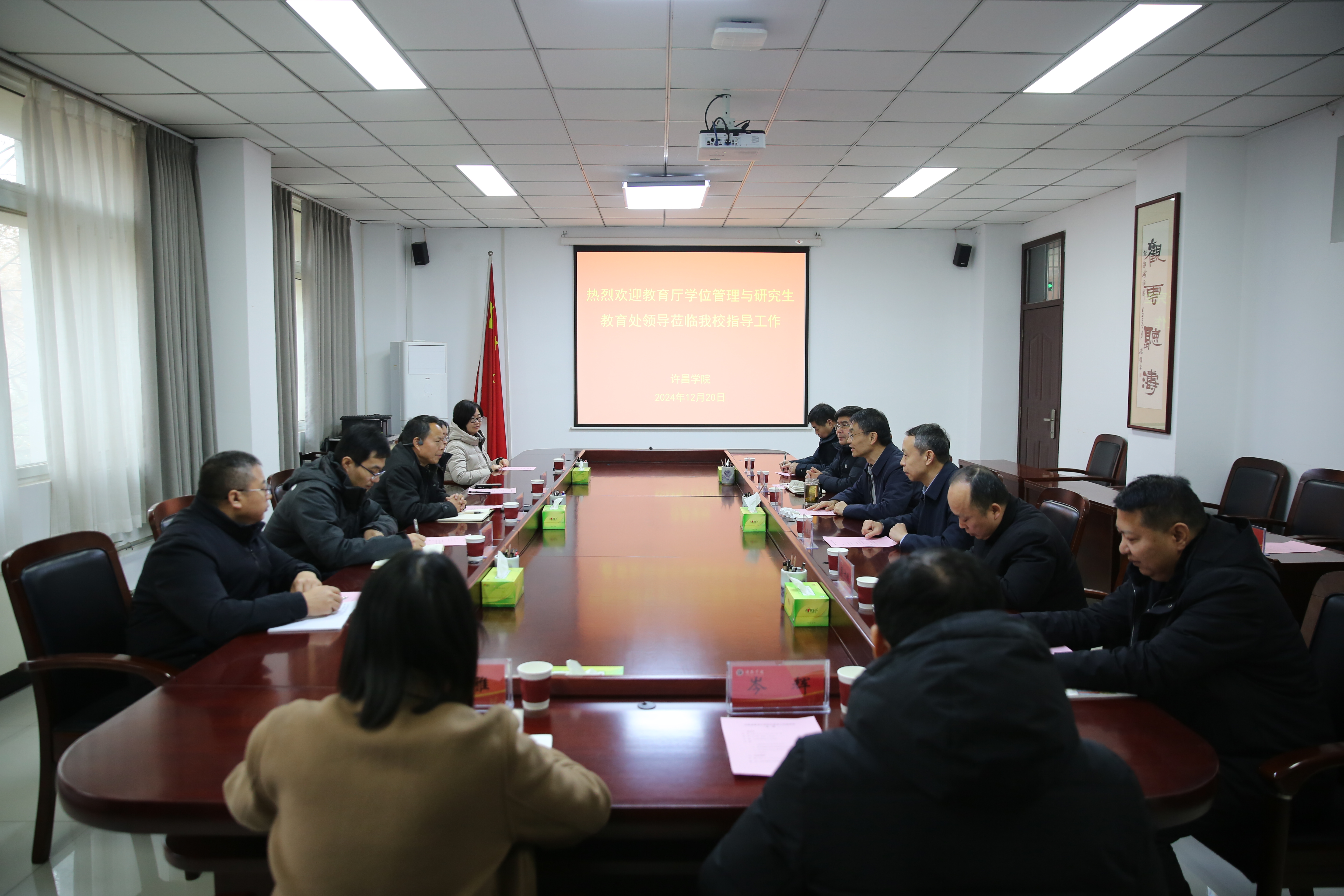 12月20日上午,河南省教育厅学位管理与研究生教育处处长岳德胜一行到我校调研。校党委书记郭涛热情接待岳德胜一行。我校在办公楼第一会议室举行座谈会,校长郑直、副校长杜根远出席座谈会。学科建设办公室及材料与化工、电子信息、食品与营养三个硕士点培育学科的相关负责人参加了座谈会。座谈会由杜根远主持。